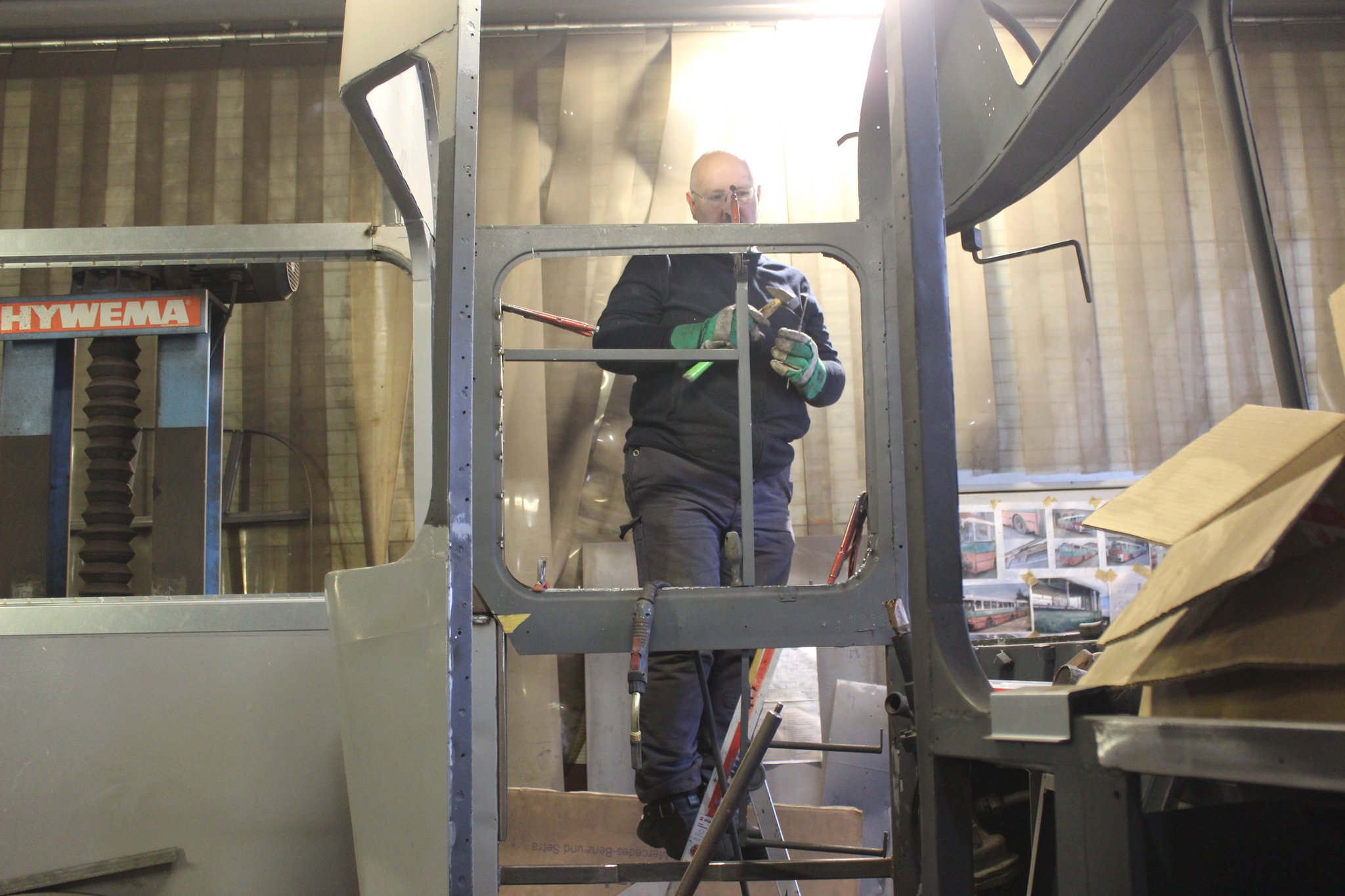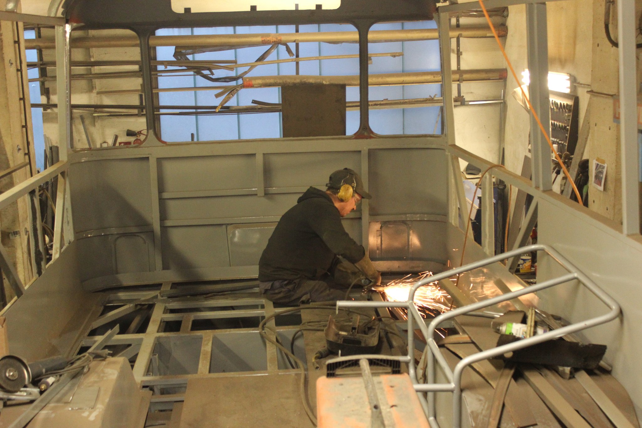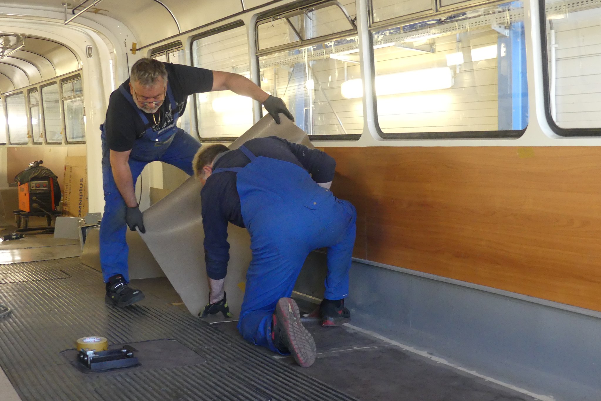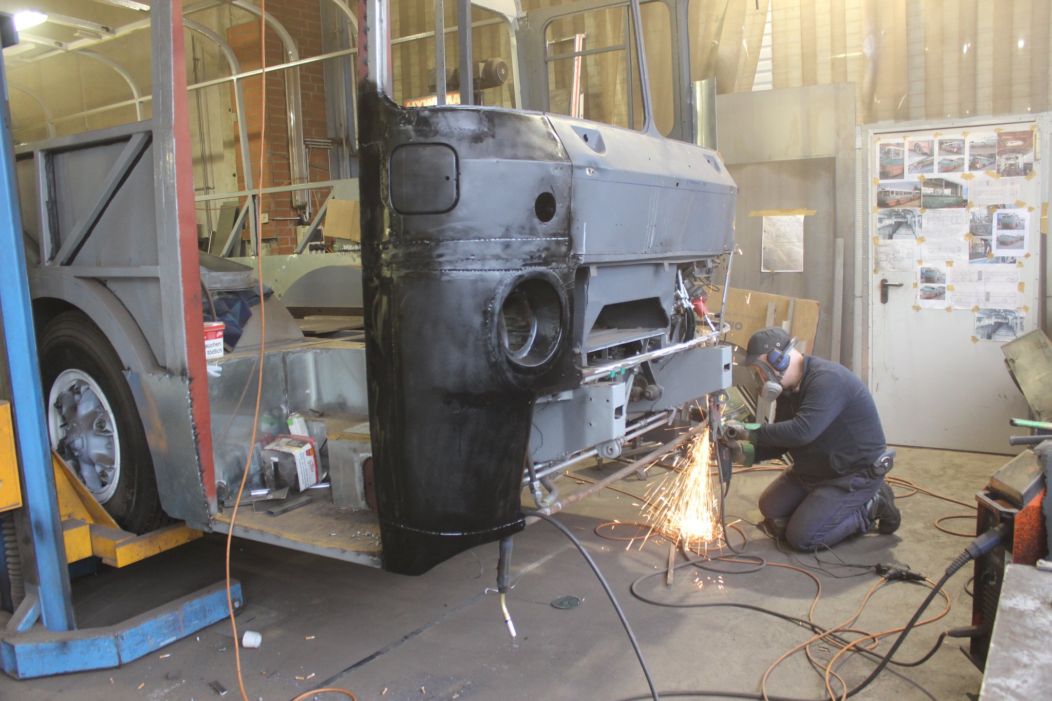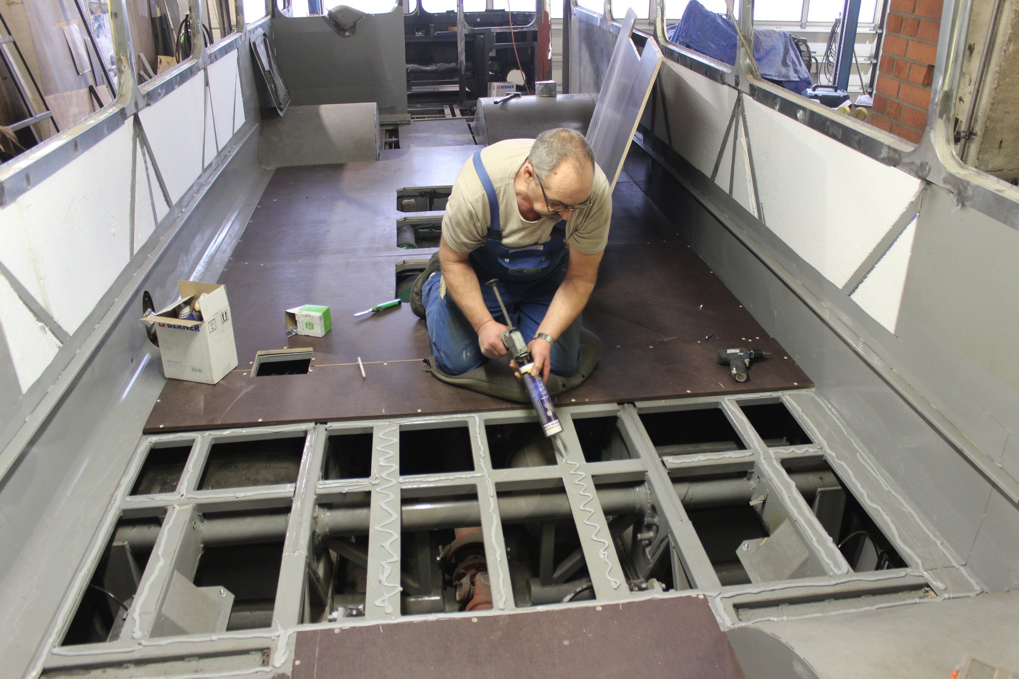 04.02.2022 - Einbau der Fußbodenplatten; Türaufnahme Tür 1 und 2; Neuanfertigung der Klappenstützen; Instandsetzung sowie Montage des Dachendblech mit Zielschildeinsatz; Instandsetzung des Fahrerfensters; Instandsetzung Stoßfänger vorn; Fahrzeugisolierung; neu angefertigte Scheibenaufnahmen einschweißen