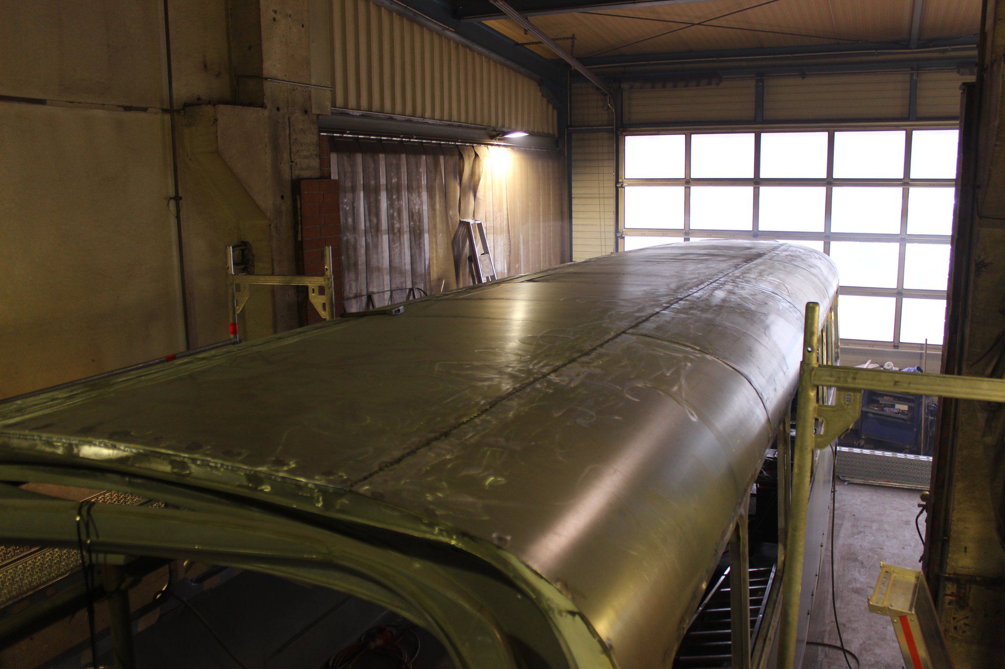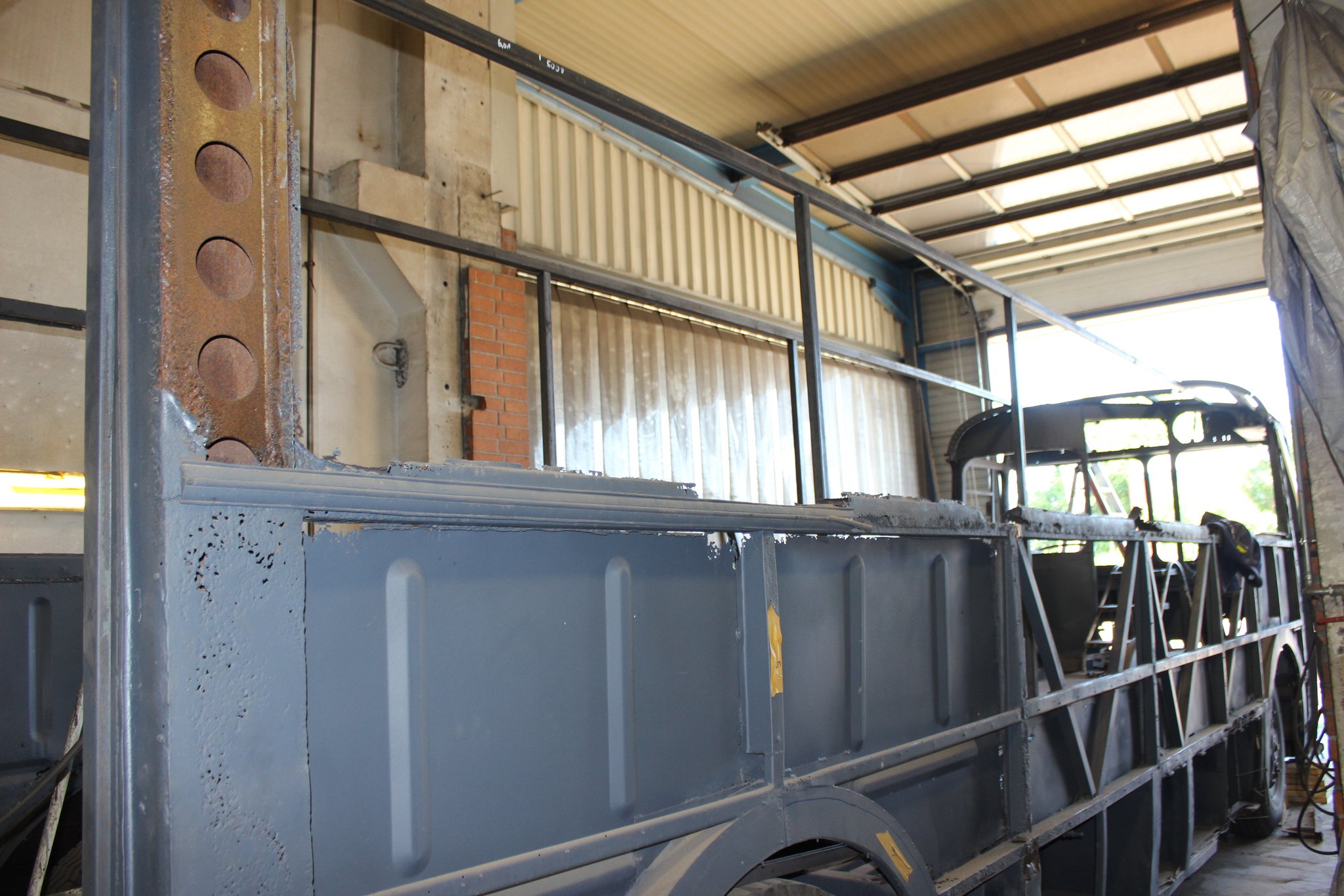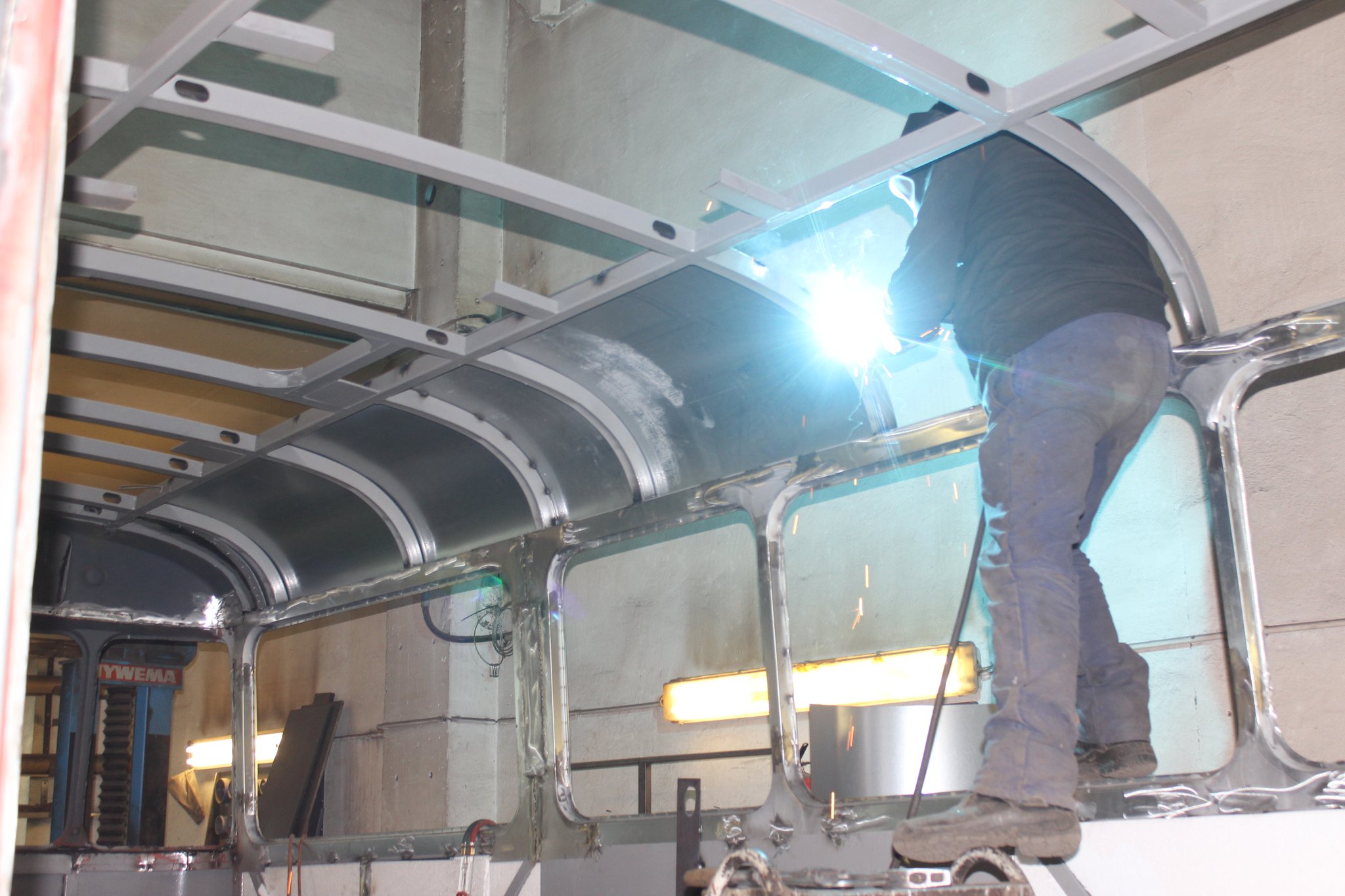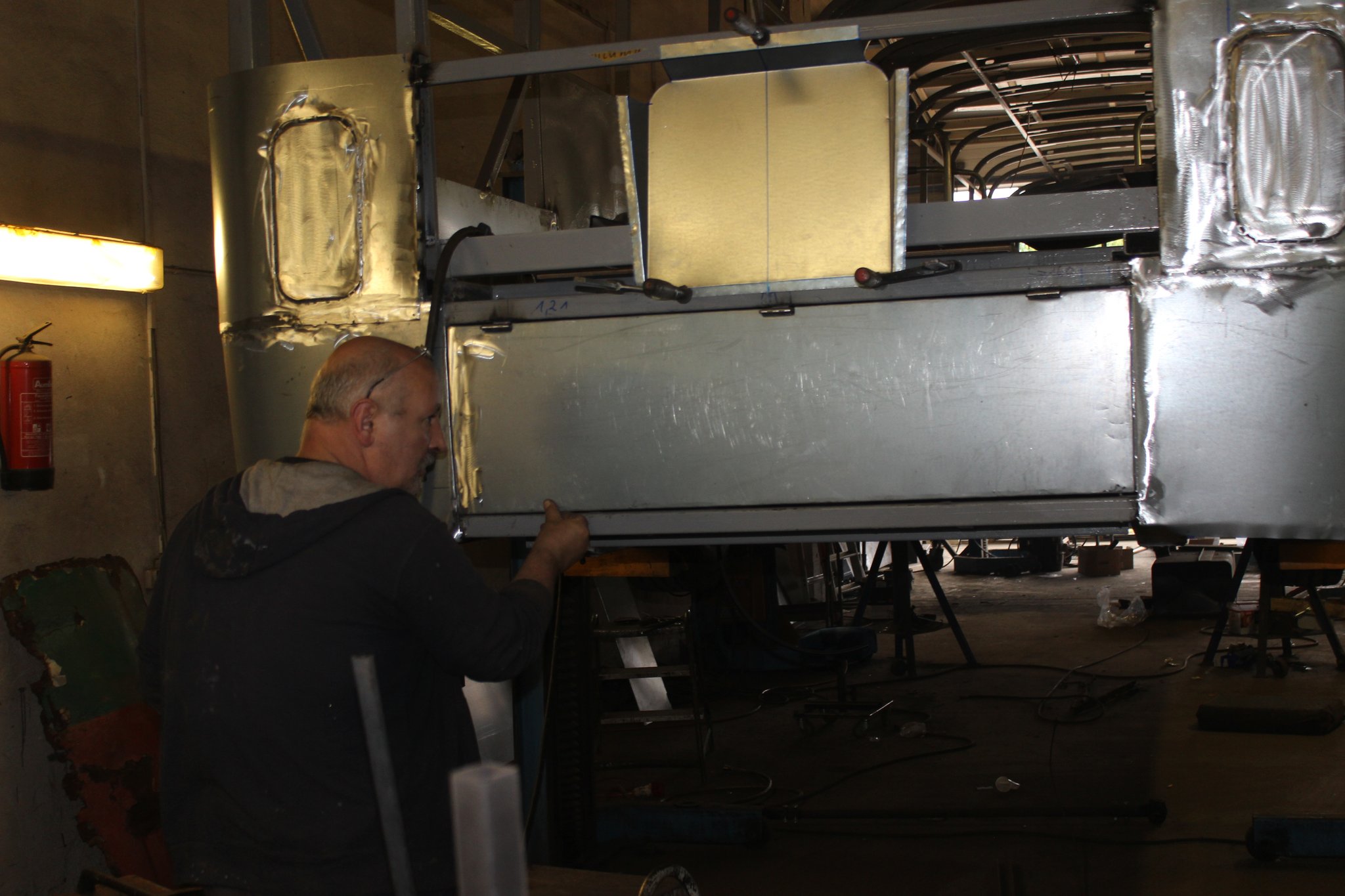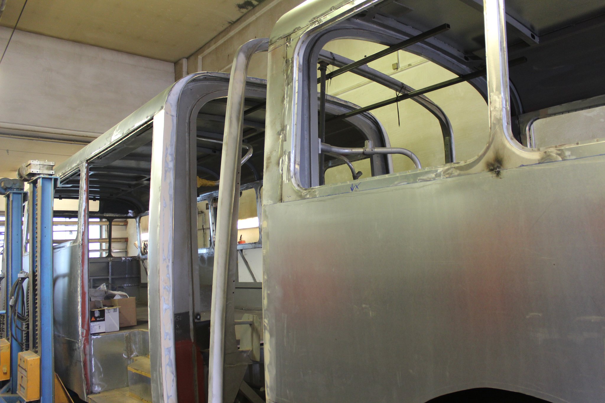 04.02.2022 - Einbau der Fußbodenplatten; Türaufnahme Tür 1 und 2; Neuanfertigung der Klappenstützen; Instandsetzung sowie Montage des Dachendblech mit Zielschildeinsatz; Instandsetzung des Fahrerfensters; Instandsetzung Stoßfänger vorn; Fahrzeugisolierung; neu angefertigte Scheibenaufnahmen einschweißen