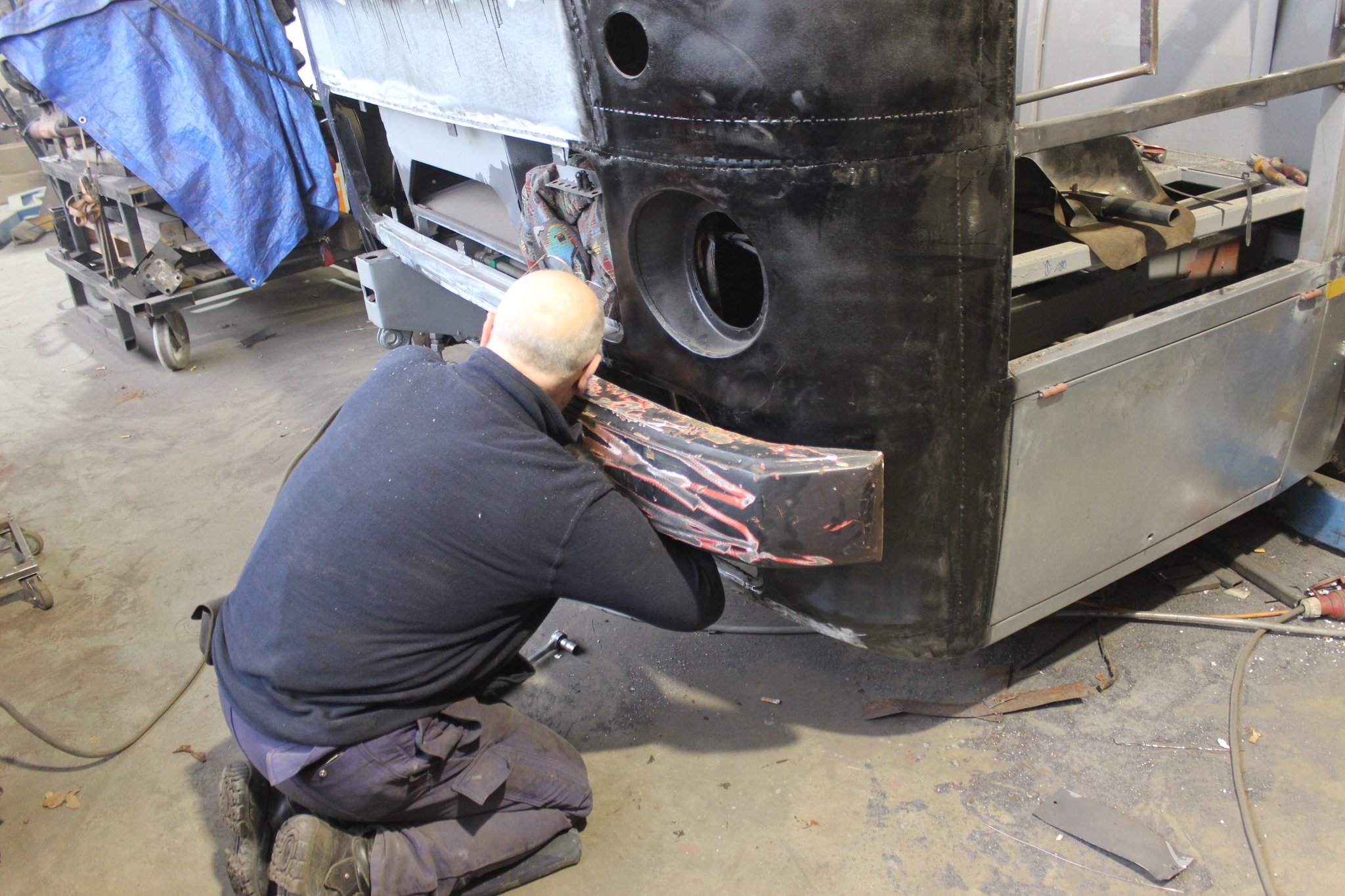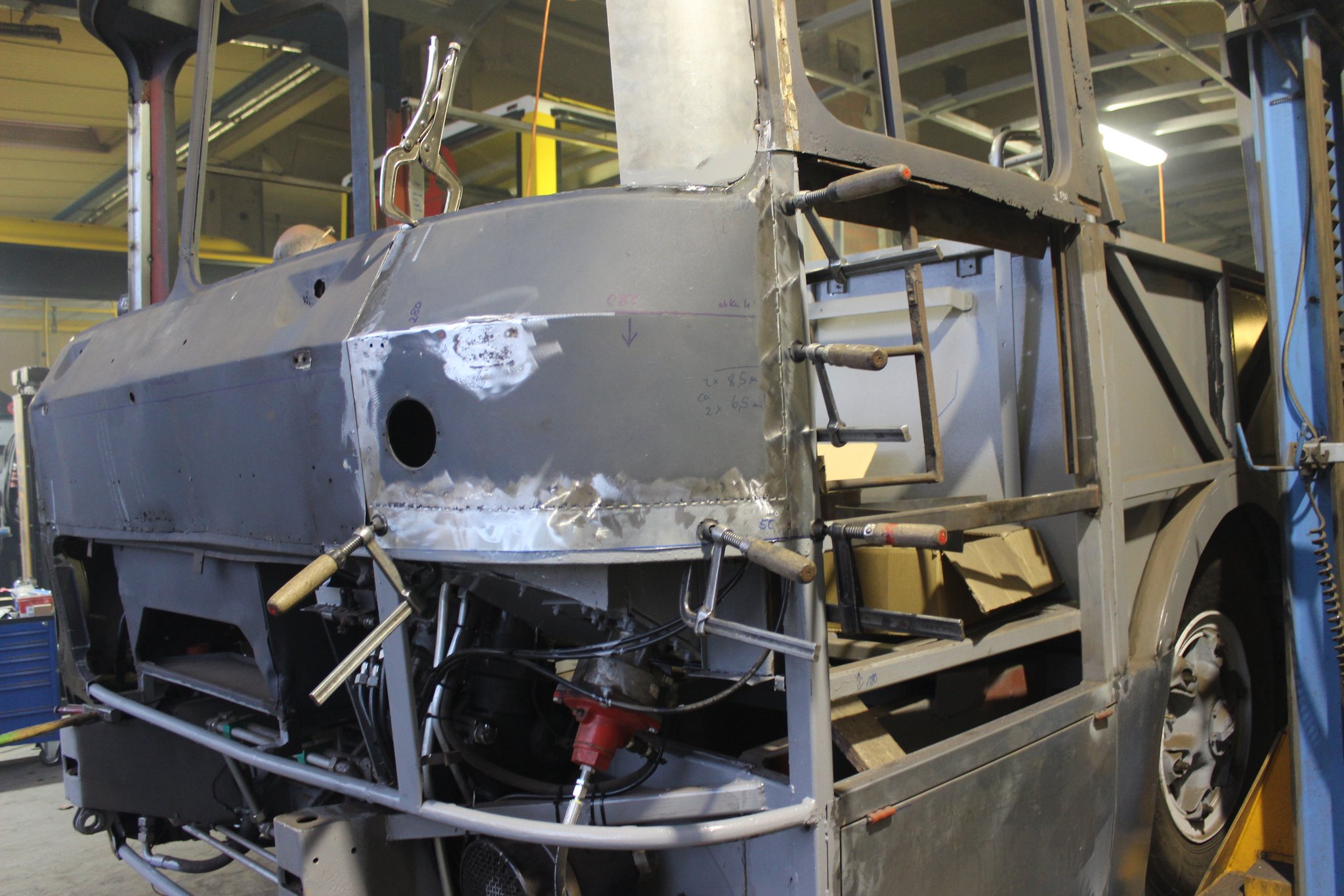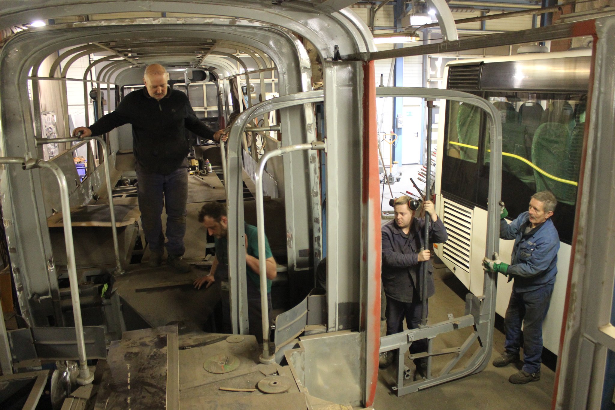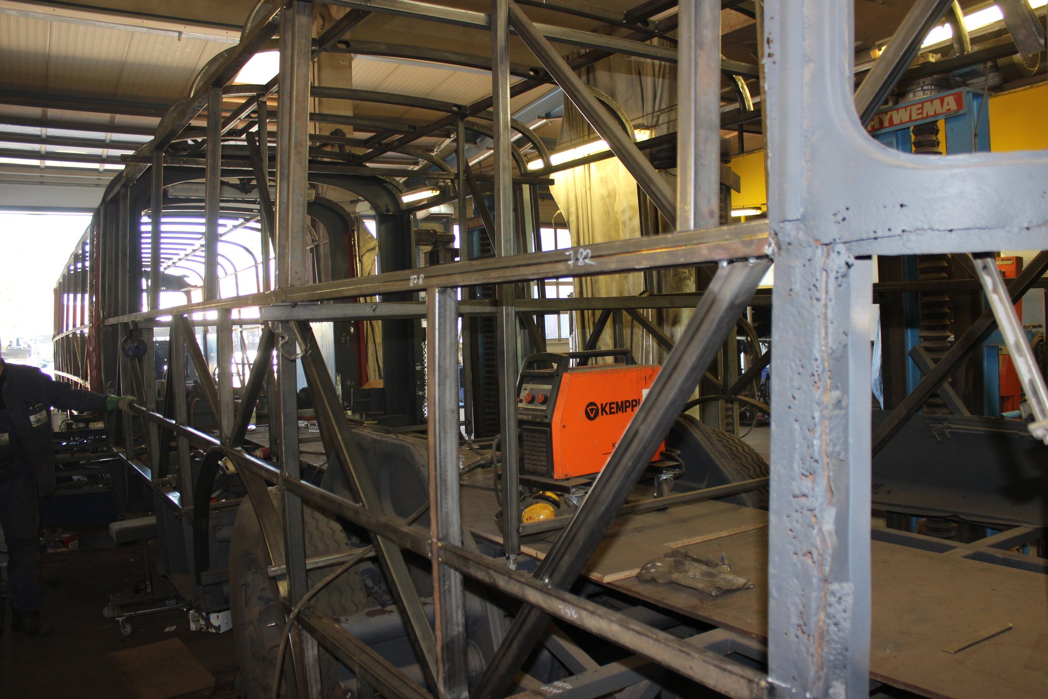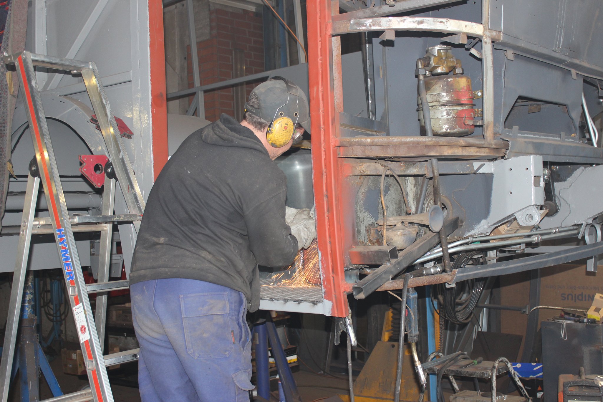 04.02.2022 - Einbau der Fußbodenplatten; Türaufnahme Tür 1 und 2; Neuanfertigung der Klappenstützen; Instandsetzung sowie Montage des Dachendblech mit Zielschildeinsatz; Instandsetzung des Fahrerfensters; Instandsetzung Stoßfänger vorn; Fahrzeugisolierung; neu angefertigte Scheibenaufnahmen einschweißen