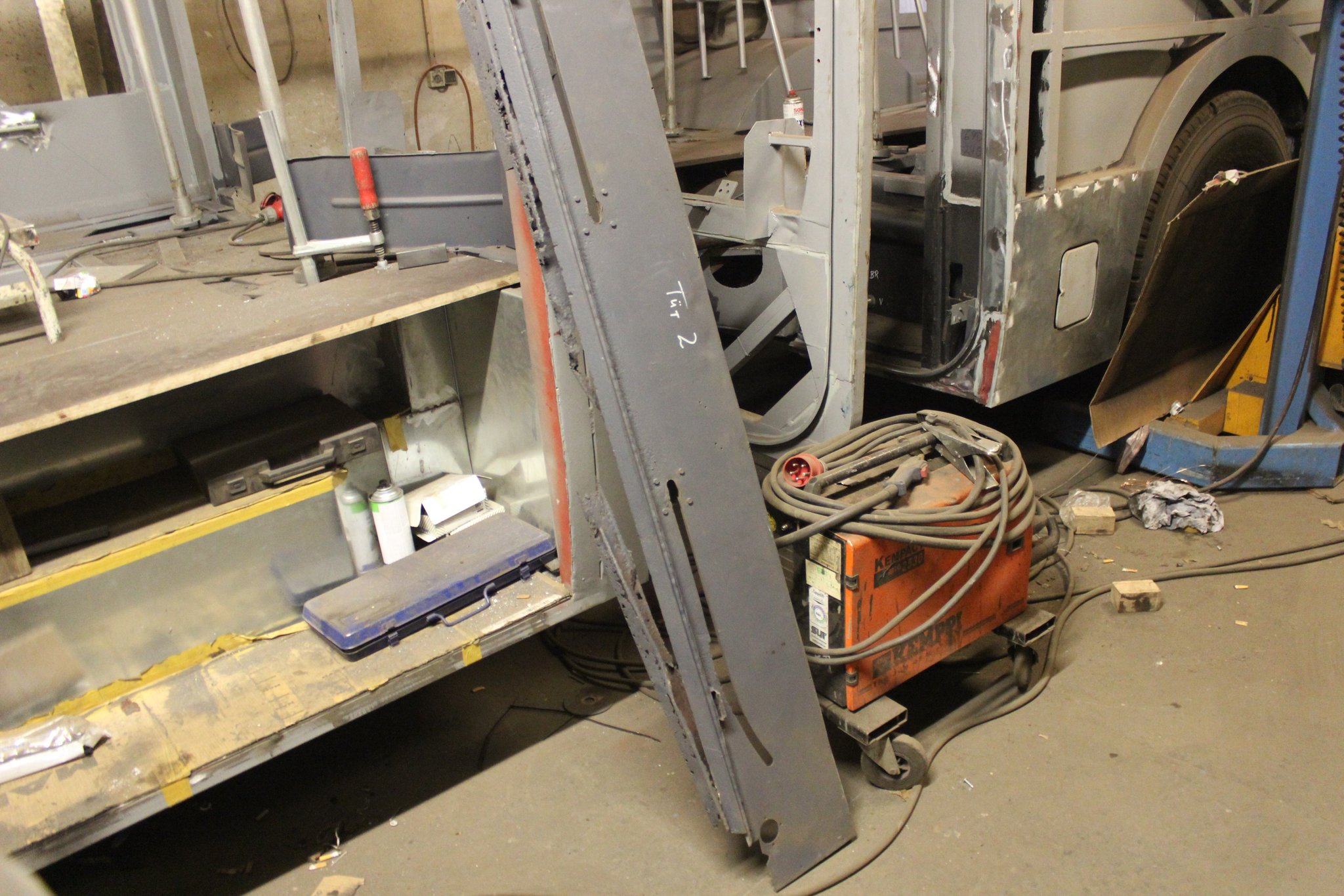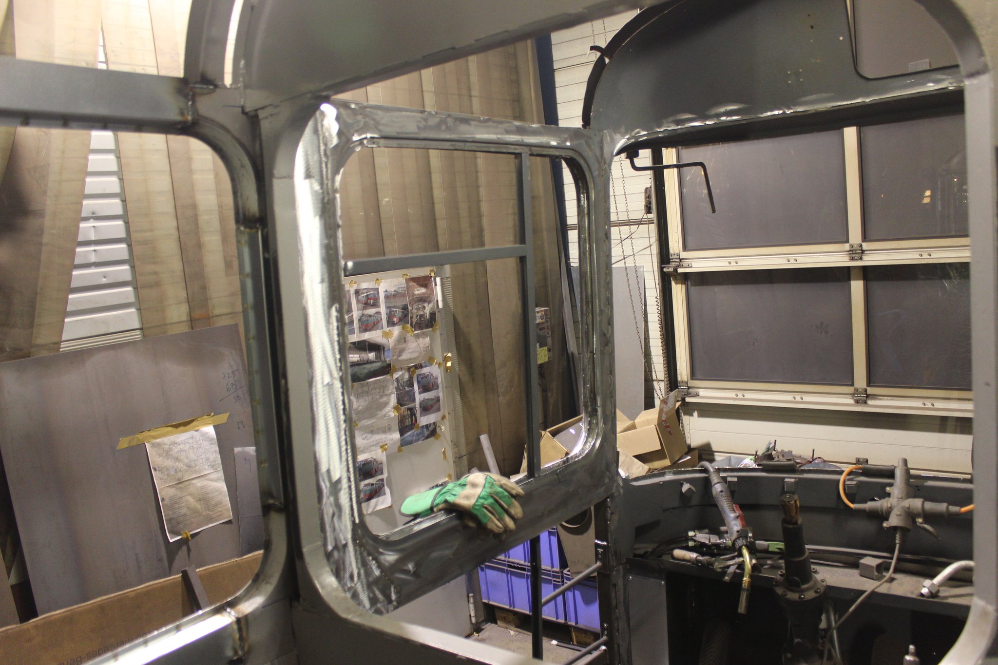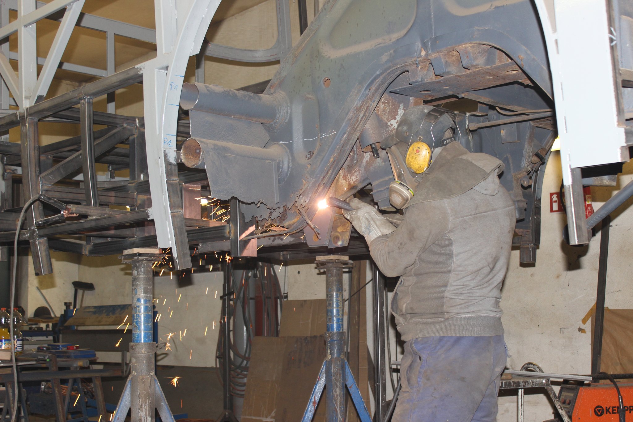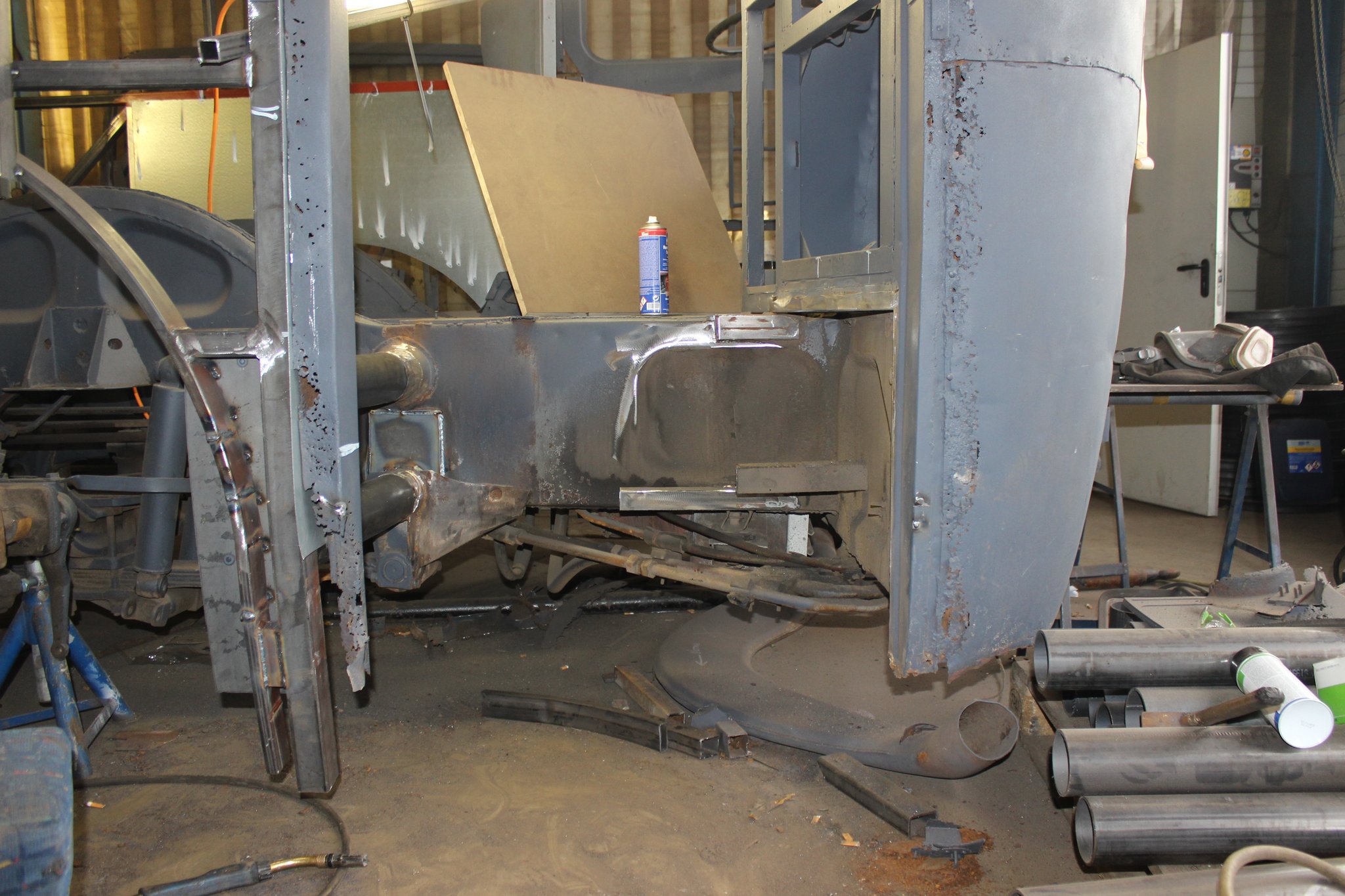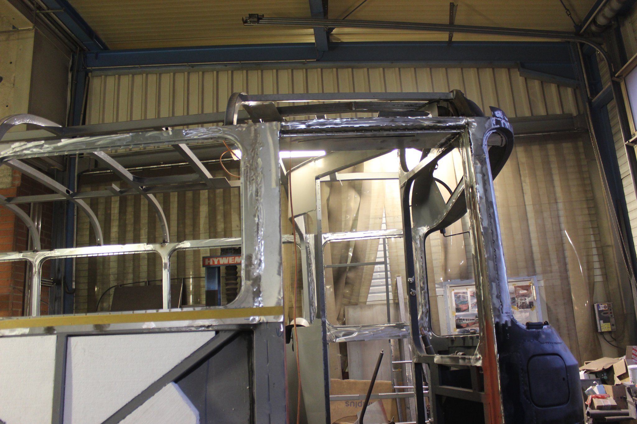 04.02.2022 - Einbau der Fußbodenplatten; Türaufnahme Tür 1 und 2; Neuanfertigung der Klappenstützen; Instandsetzung sowie Montage des Dachendblech mit Zielschildeinsatz; Instandsetzung des Fahrerfensters; Instandsetzung Stoßfänger vorn; Fahrzeugisolierung; neu angefertigte Scheibenaufnahmen einschweißen