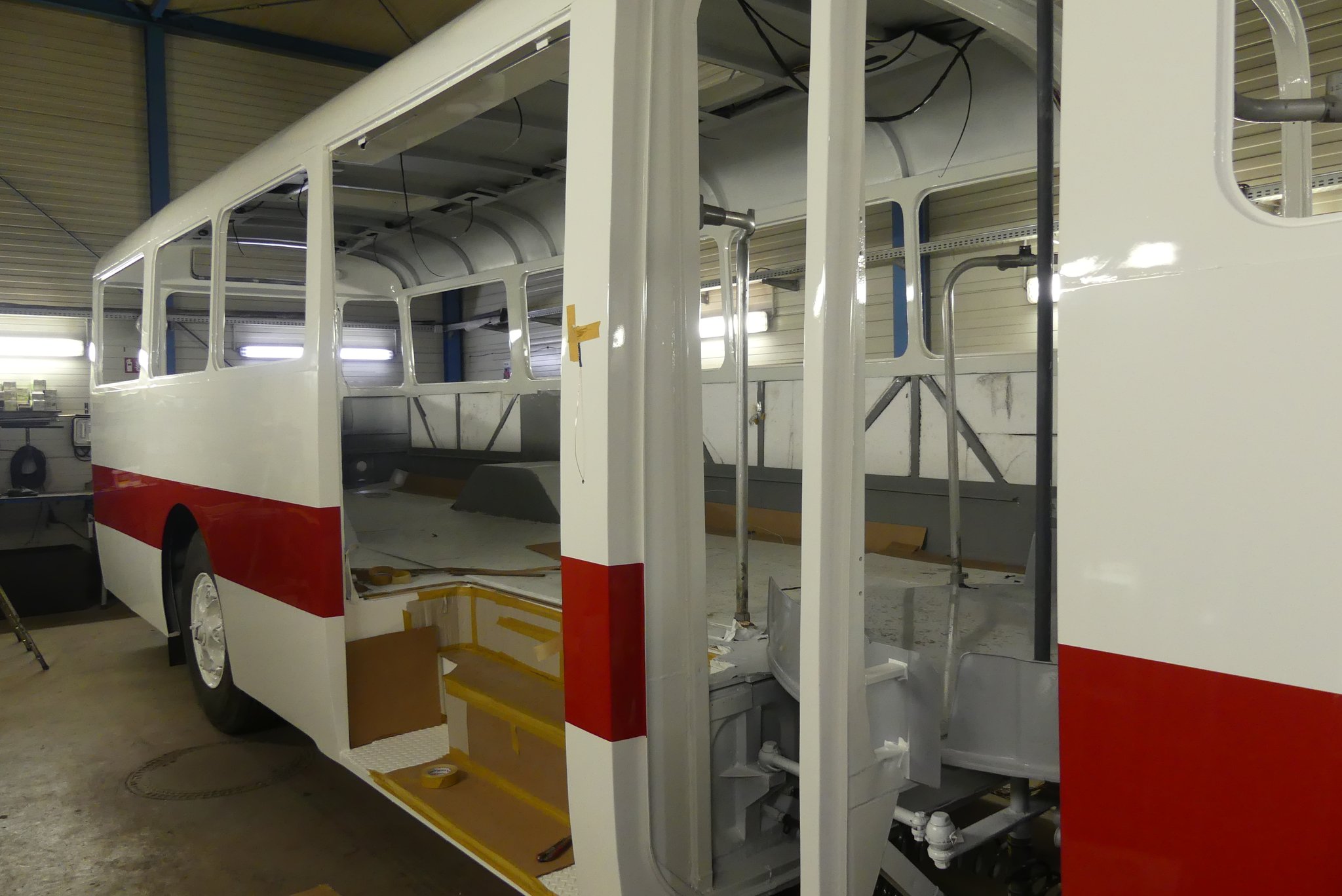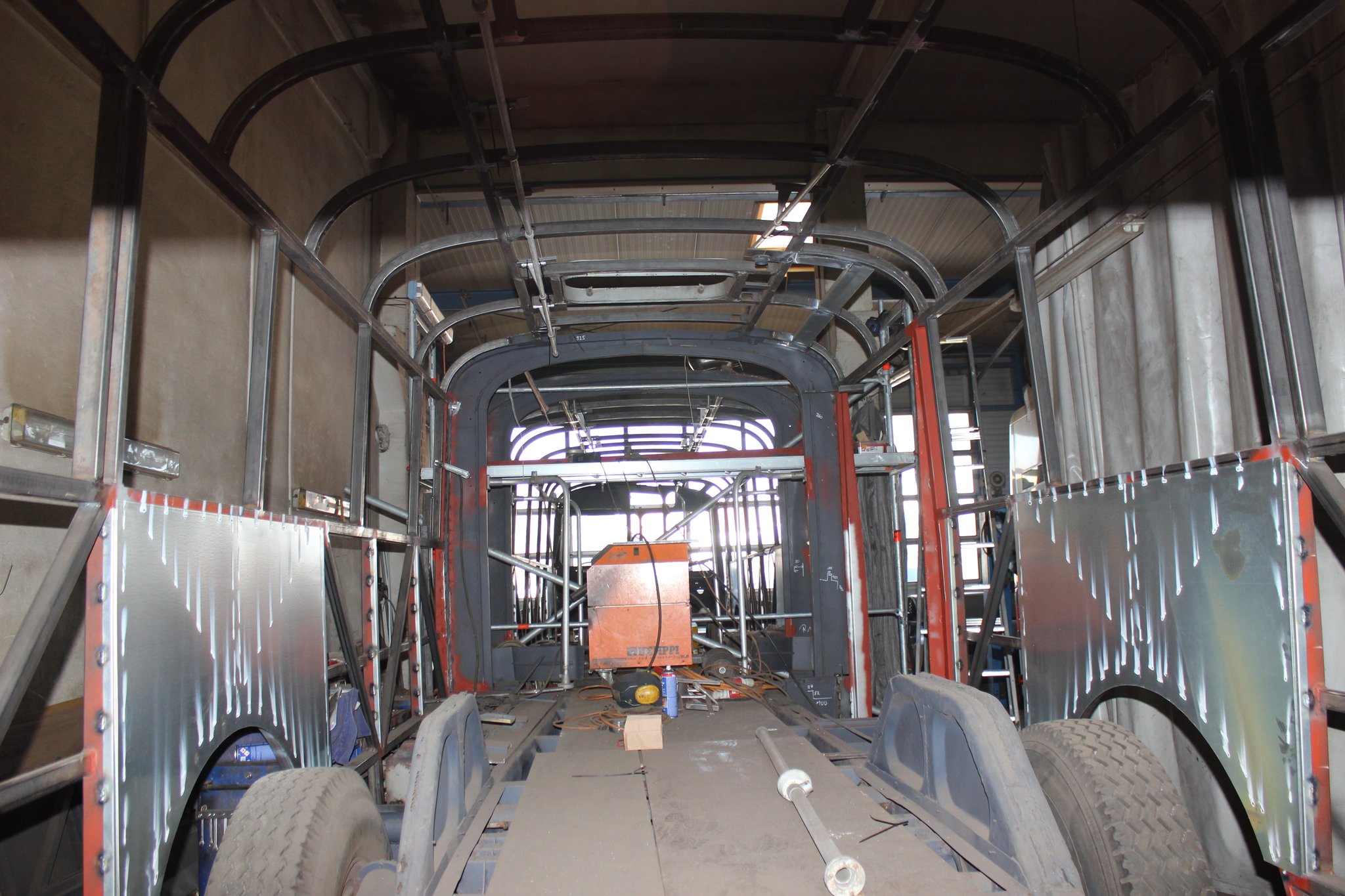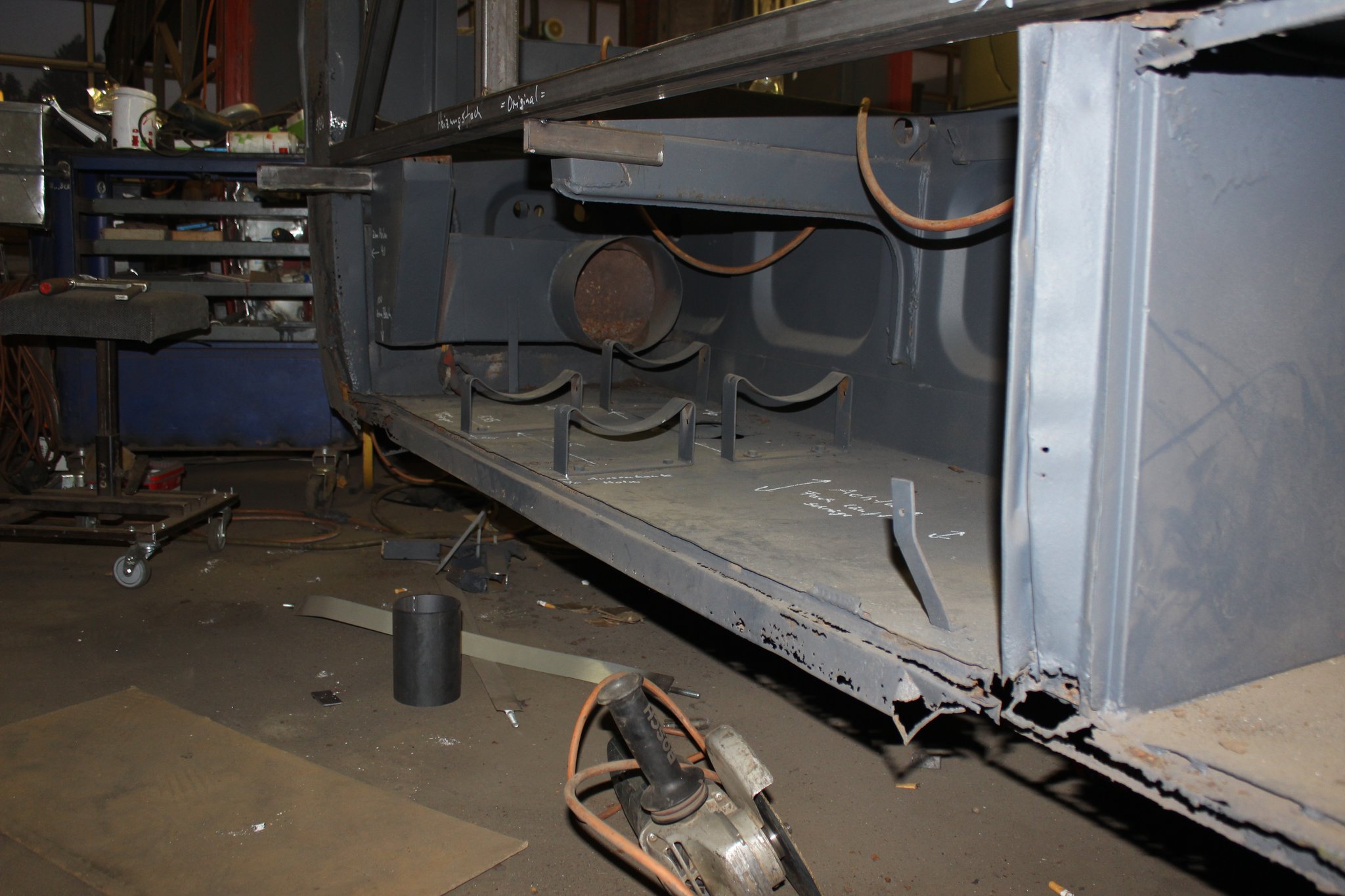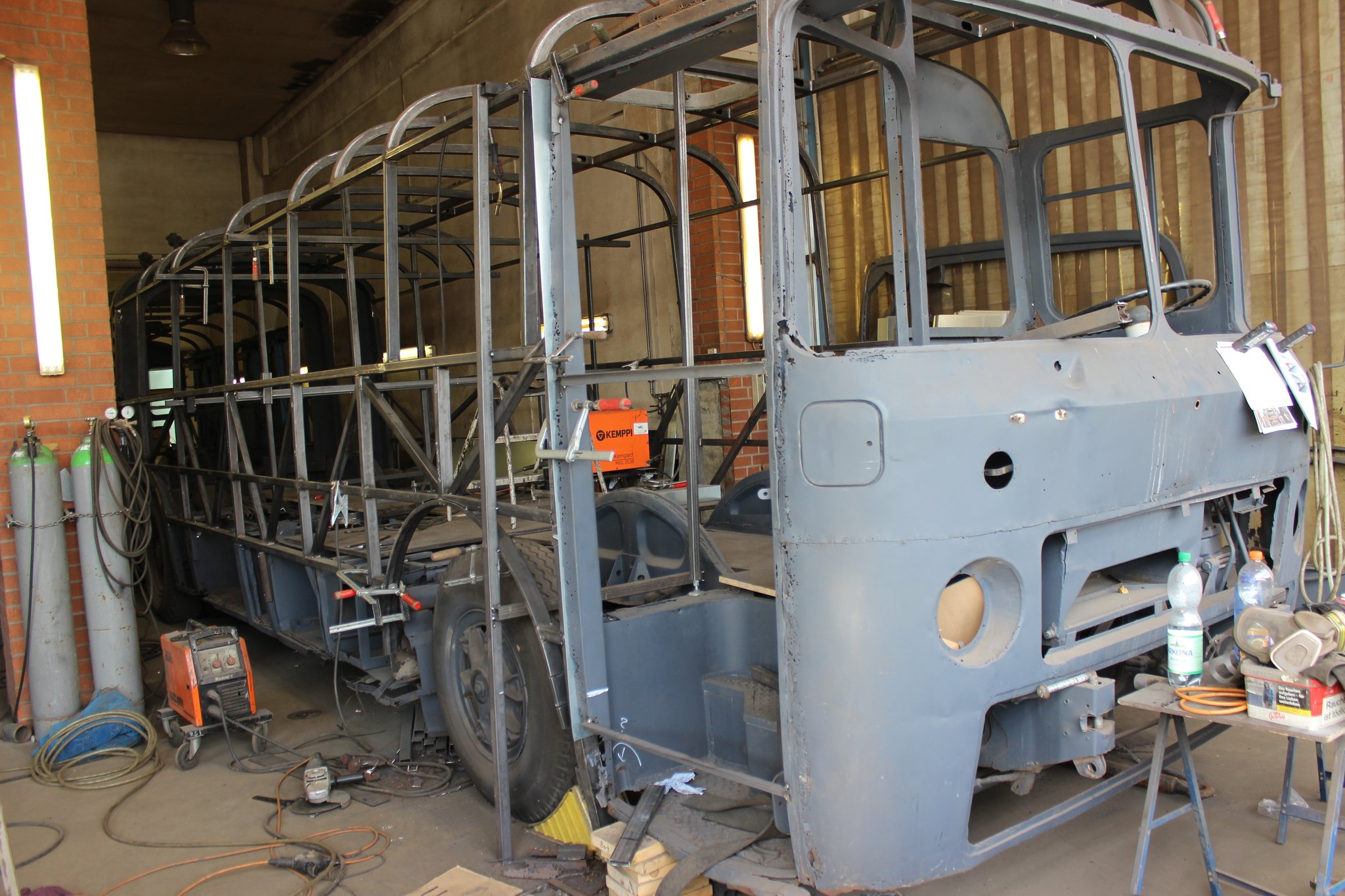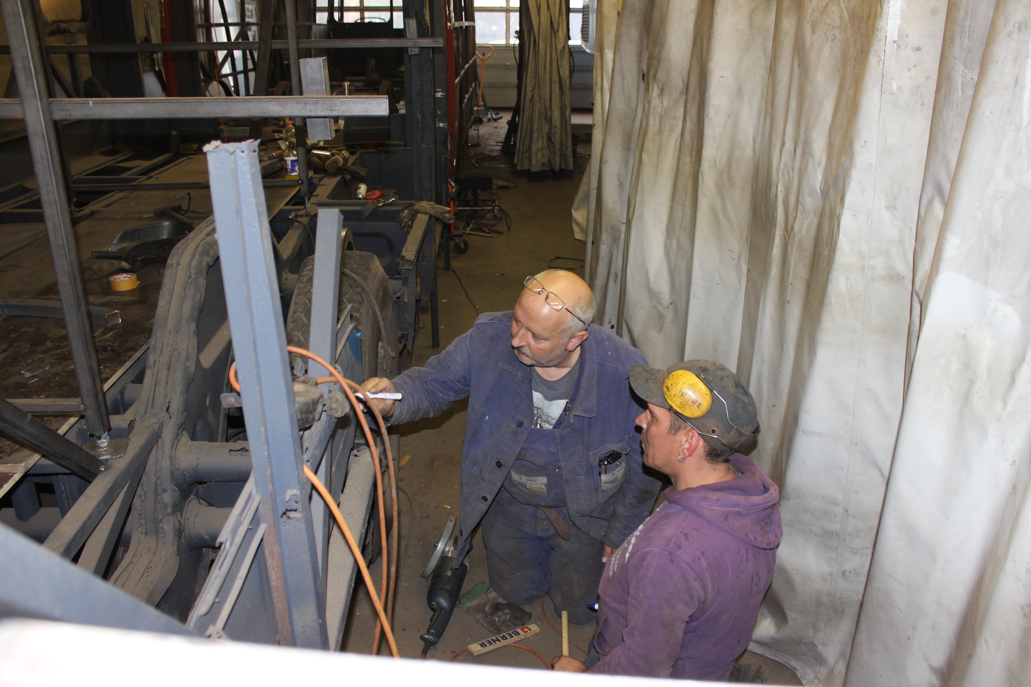 04.02.2022 - Einbau der Fußbodenplatten; Türaufnahme Tür 1 und 2; Neuanfertigung der Klappenstützen; Instandsetzung sowie Montage des Dachendblech mit Zielschildeinsatz; Instandsetzung des Fahrerfensters; Instandsetzung Stoßfänger vorn; Fahrzeugisolierung; neu angefertigte Scheibenaufnahmen einschweißen