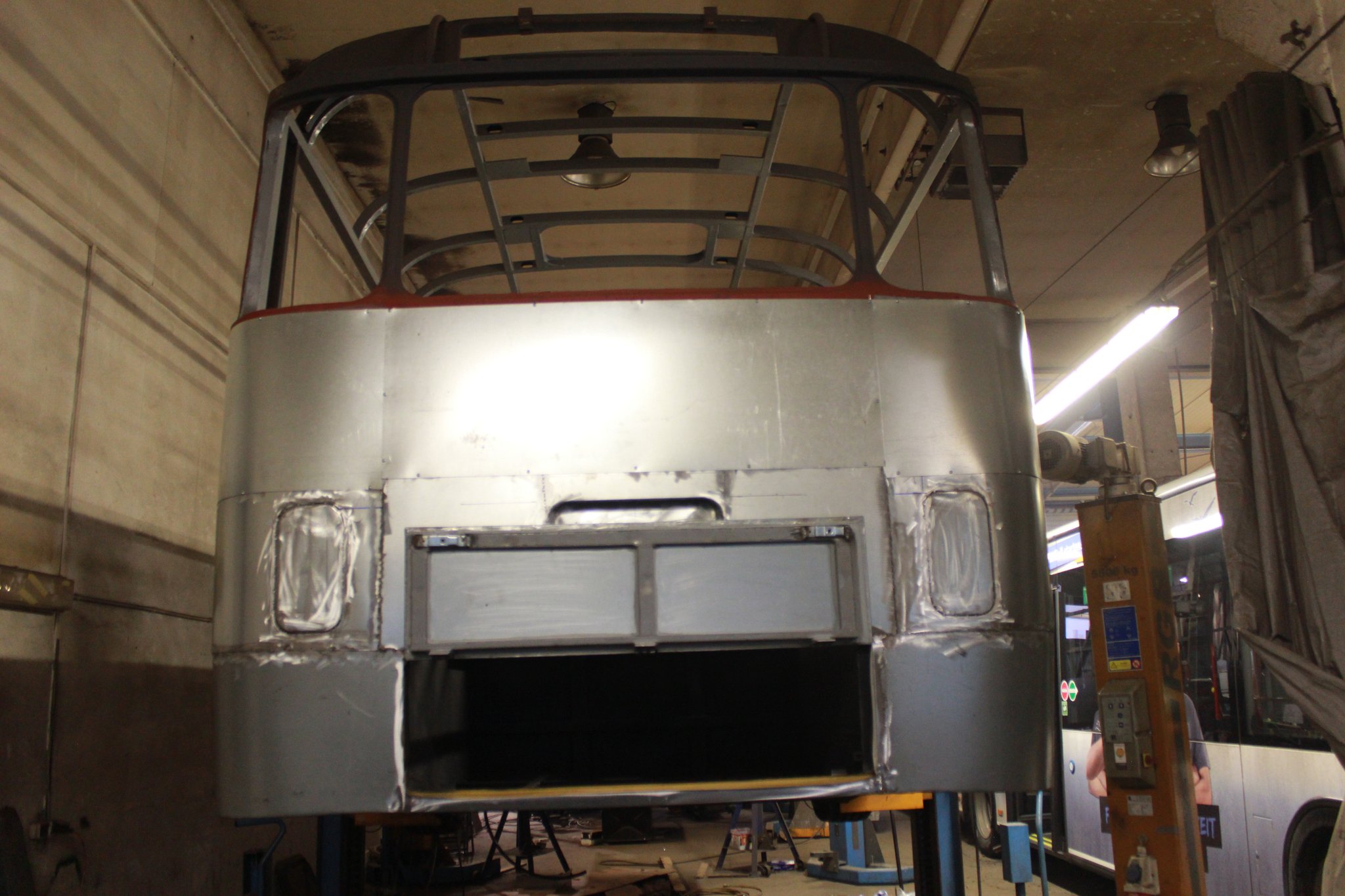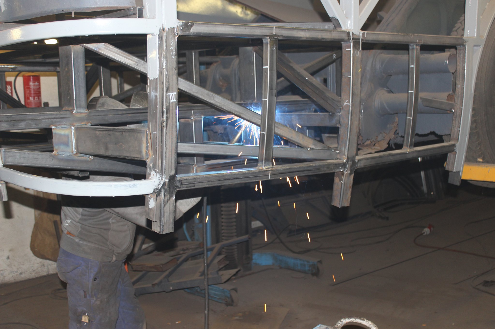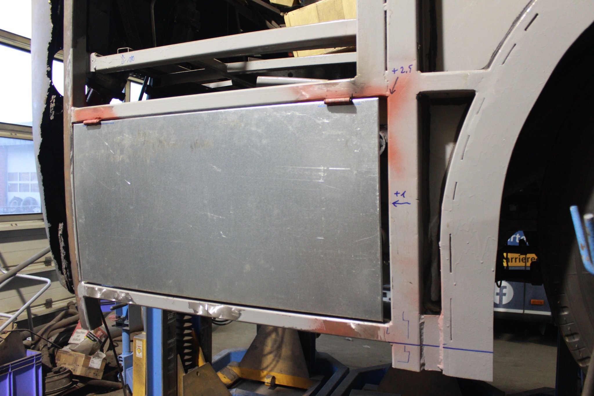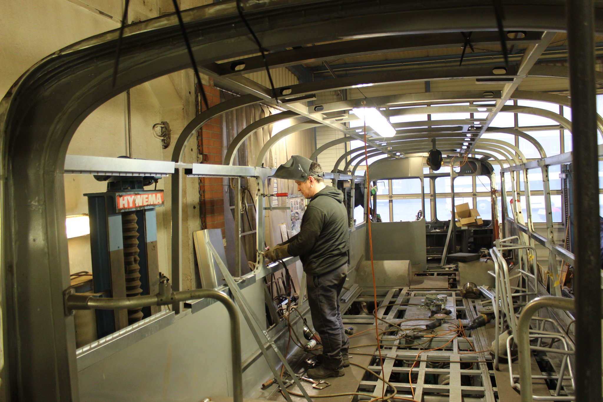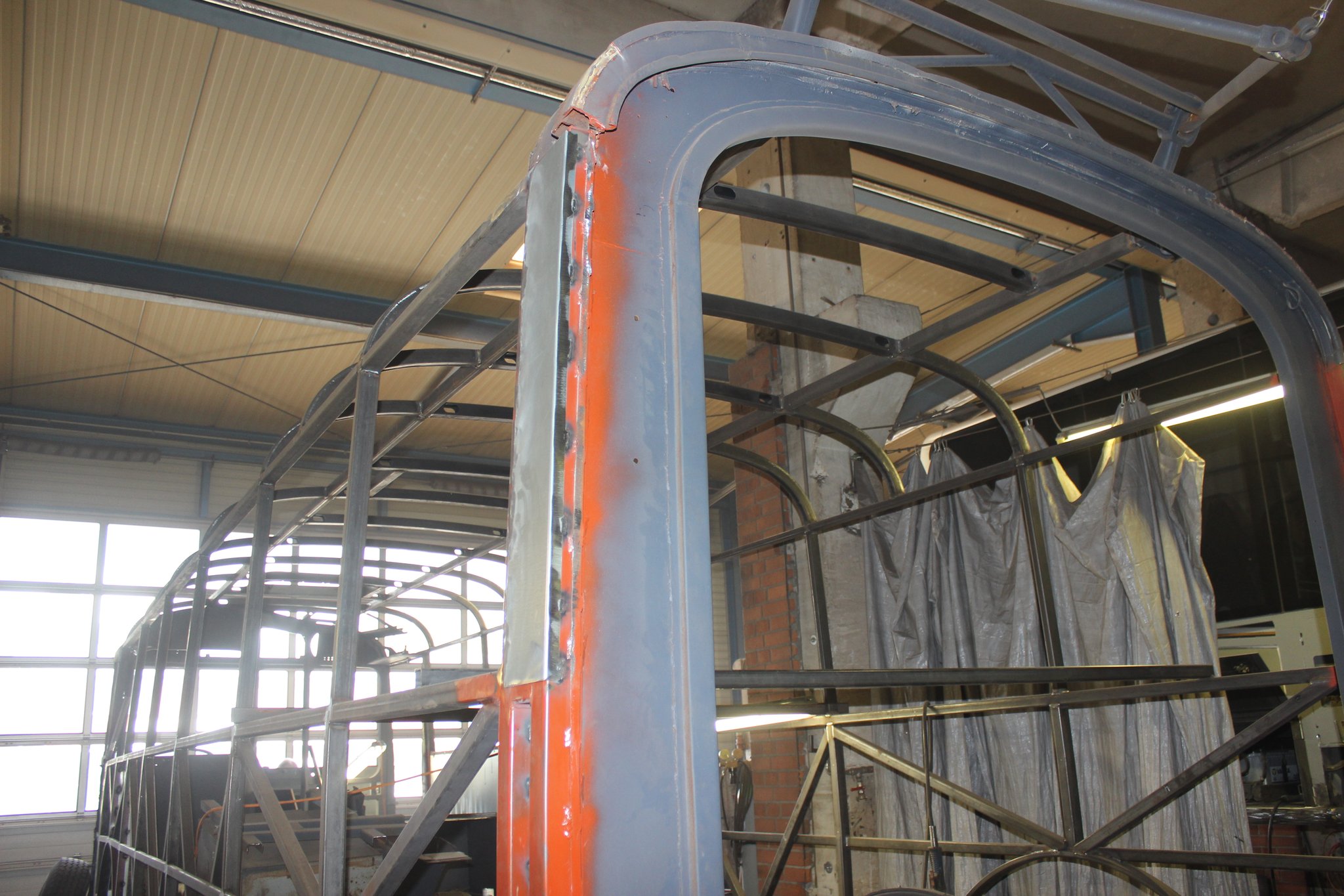 04.02.2022 - Einbau der Fußbodenplatten; Türaufnahme Tür 1 und 2; Neuanfertigung der Klappenstützen; Instandsetzung sowie Montage des Dachendblech mit Zielschildeinsatz; Instandsetzung des Fahrerfensters; Instandsetzung Stoßfänger vorn; Fahrzeugisolierung; neu angefertigte Scheibenaufnahmen einschweißen
