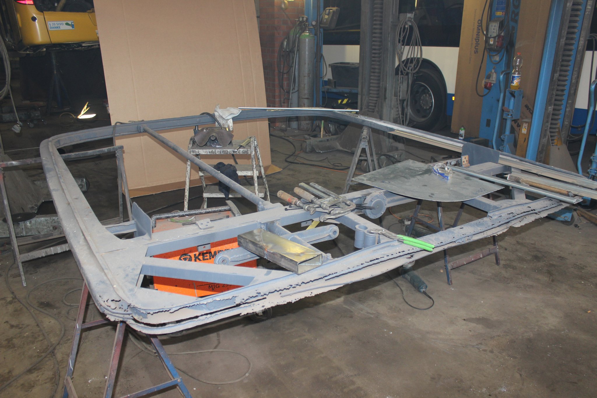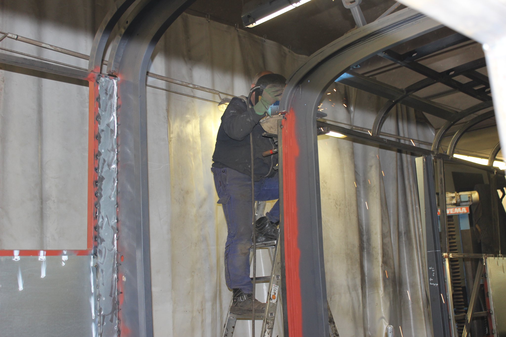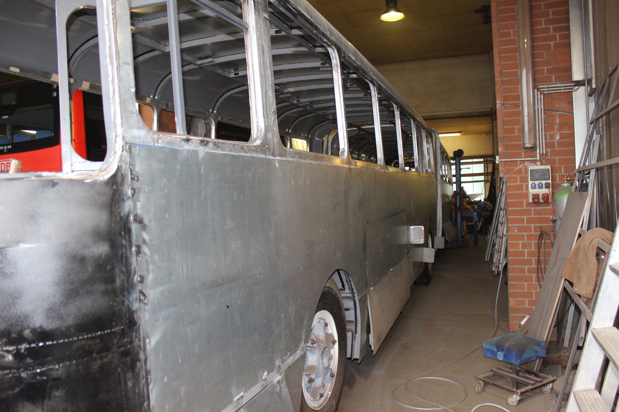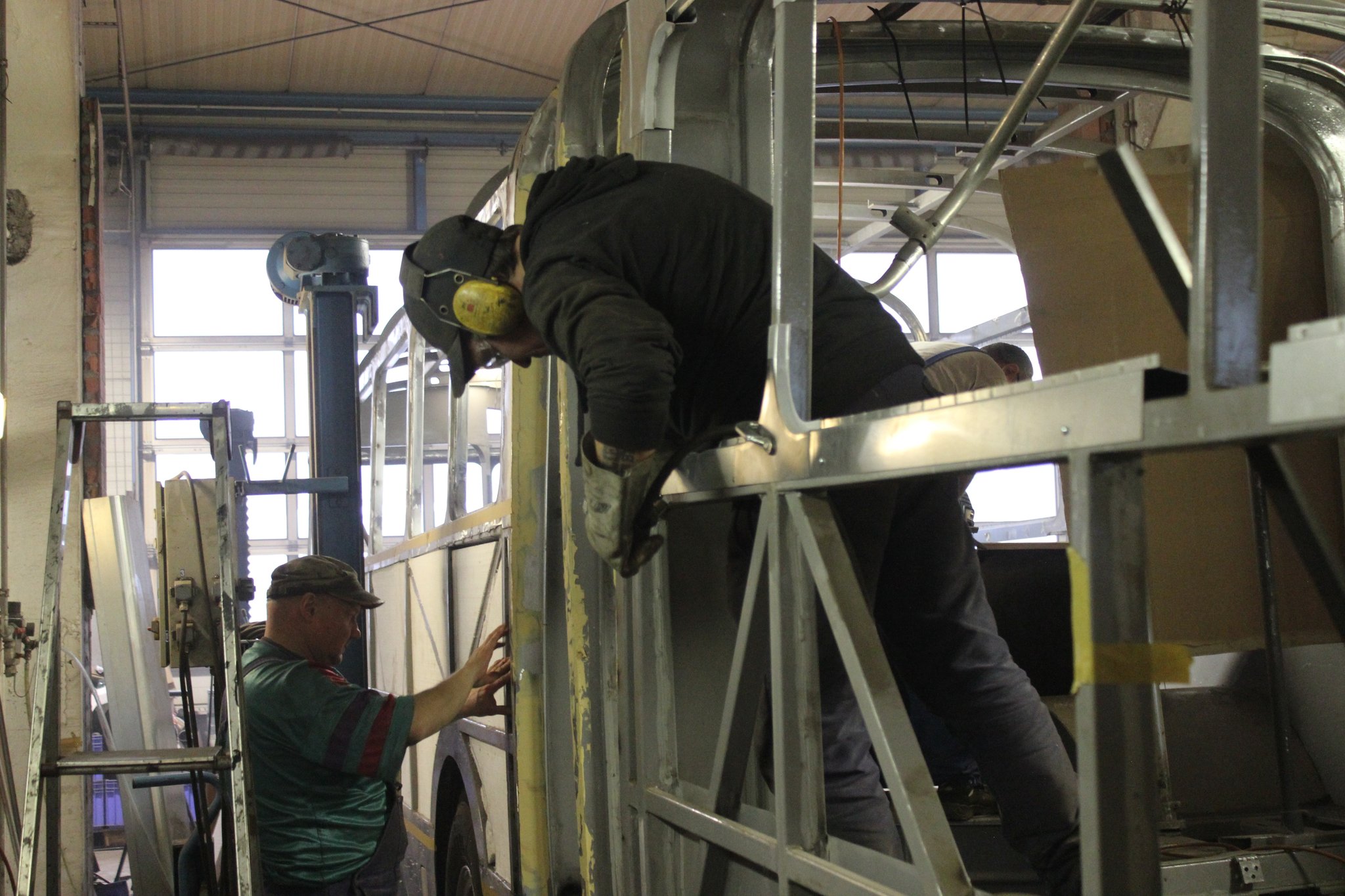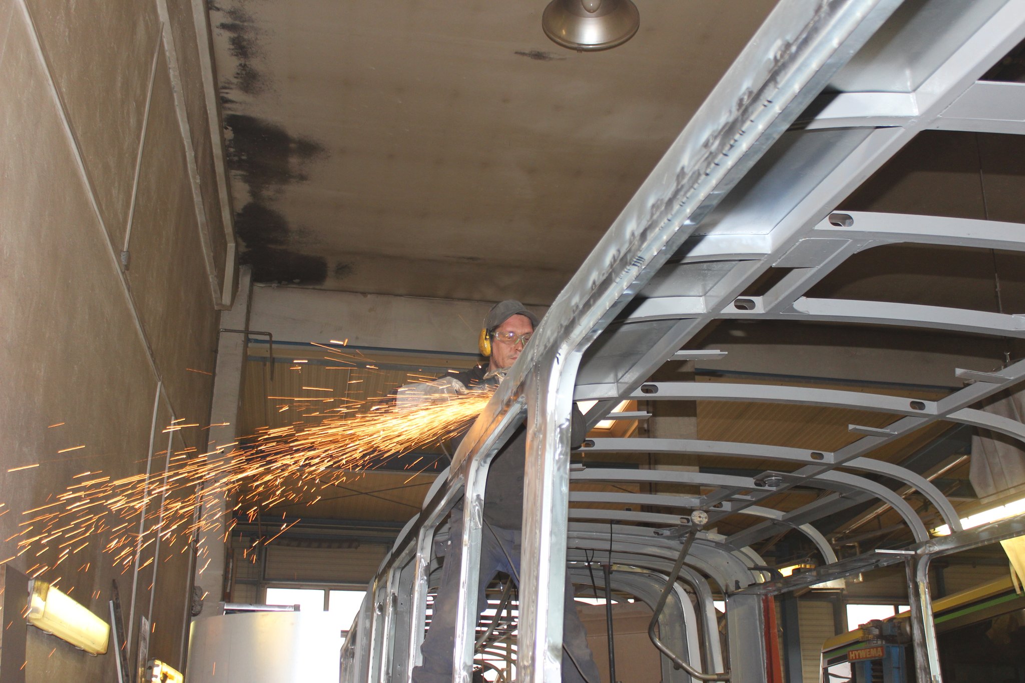 04.02.2022 - Einbau der Fußbodenplatten; Türaufnahme Tür 1 und 2; Neuanfertigung der Klappenstützen; Instandsetzung sowie Montage des Dachendblech mit Zielschildeinsatz; Instandsetzung des Fahrerfensters; Instandsetzung Stoßfänger vorn; Fahrzeugisolierung; neu angefertigte Scheibenaufnahmen einschweißen