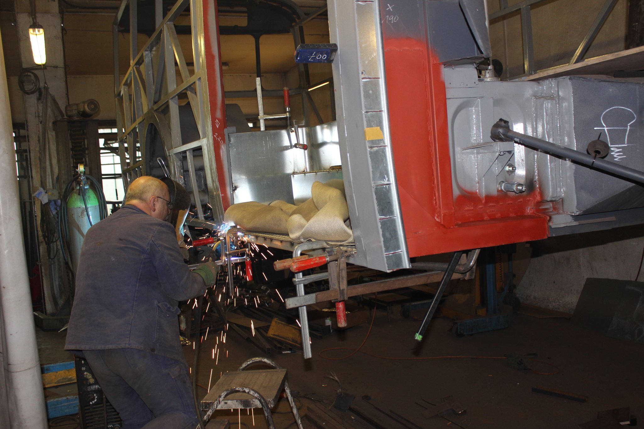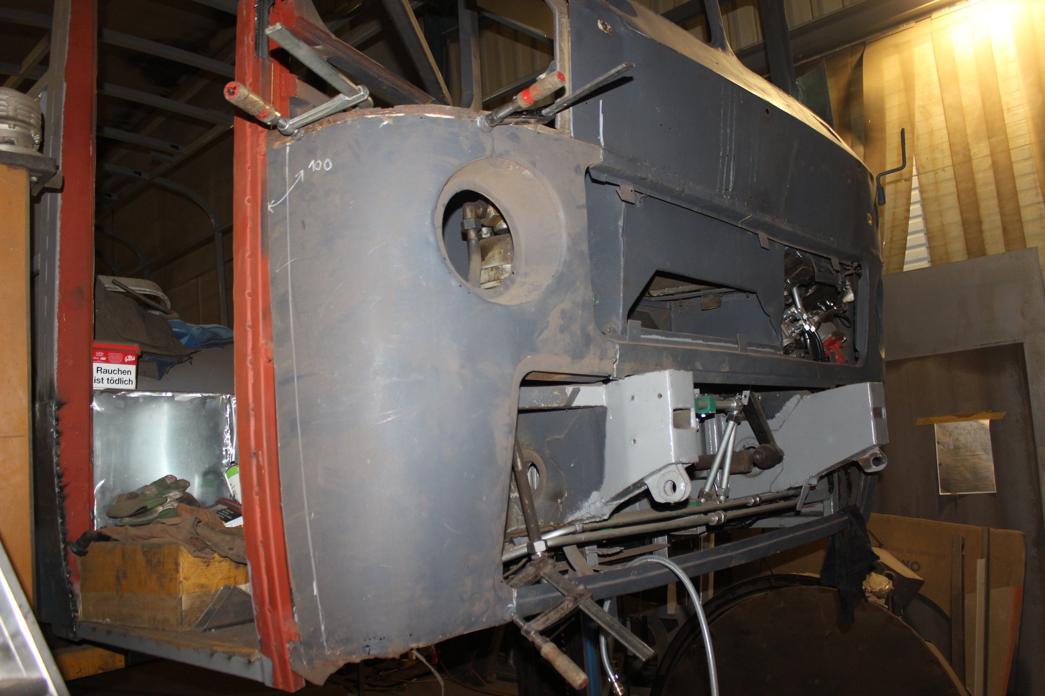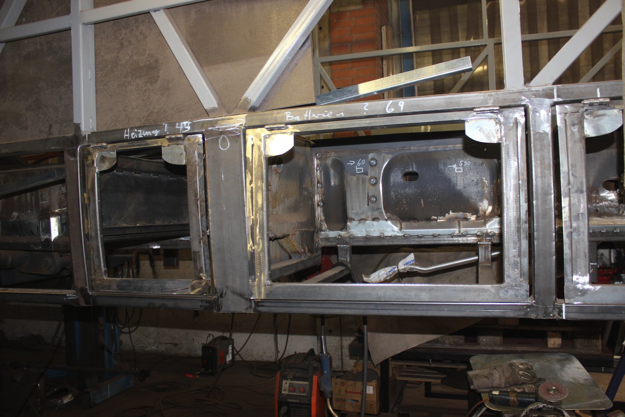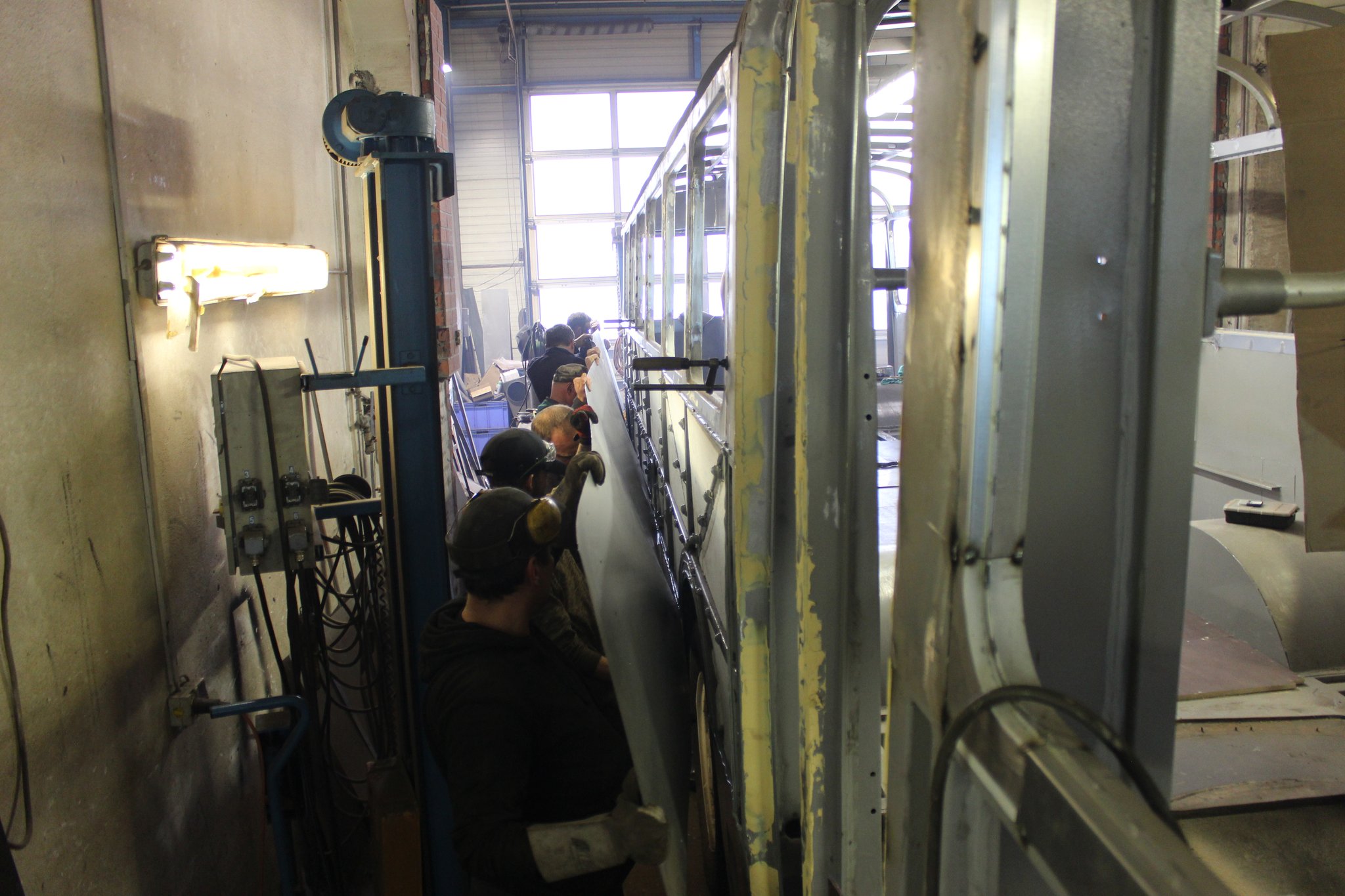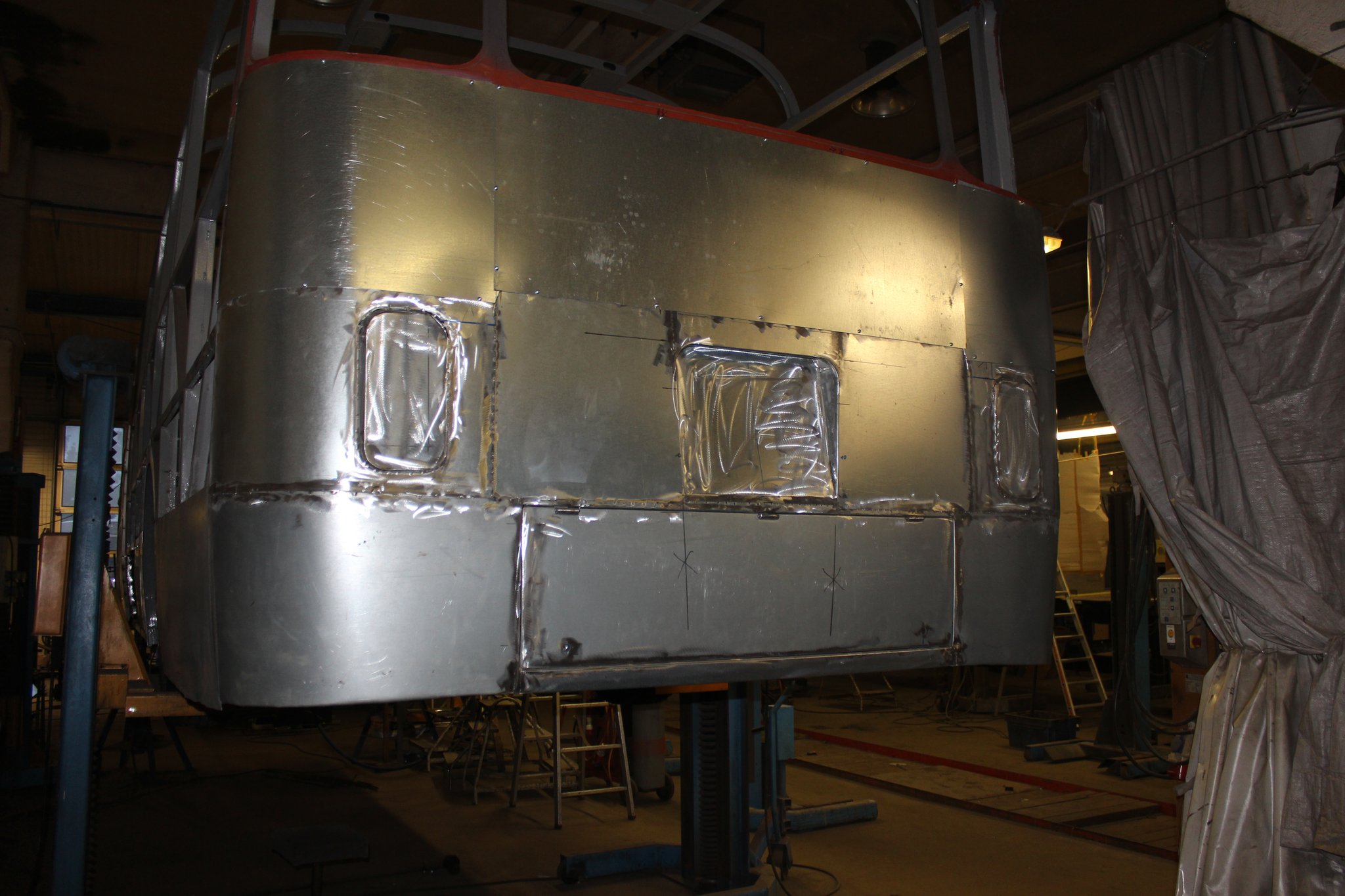 04.02.2022 - Einbau der Fußbodenplatten; Türaufnahme Tür 1 und 2; Neuanfertigung der Klappenstützen; Instandsetzung sowie Montage des Dachendblech mit Zielschildeinsatz; Instandsetzung des Fahrerfensters; Instandsetzung Stoßfänger vorn; Fahrzeugisolierung; neu angefertigte Scheibenaufnahmen einschweißen