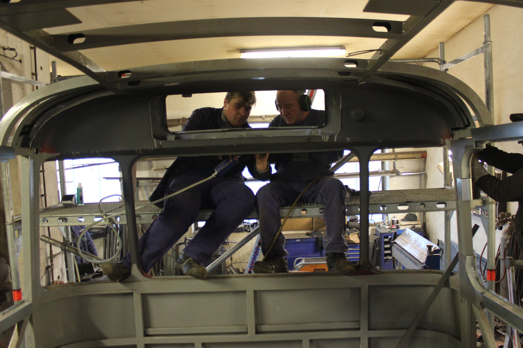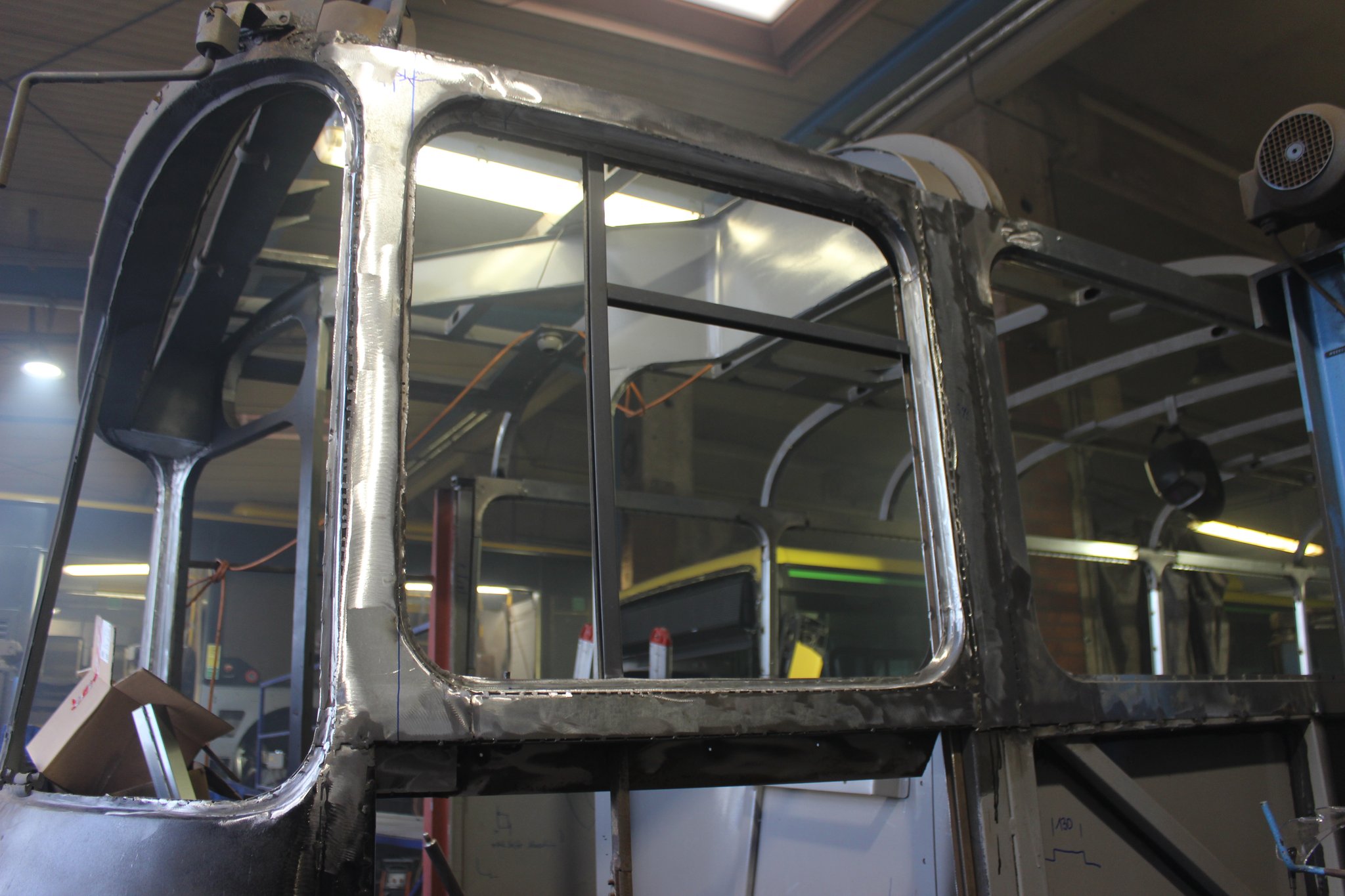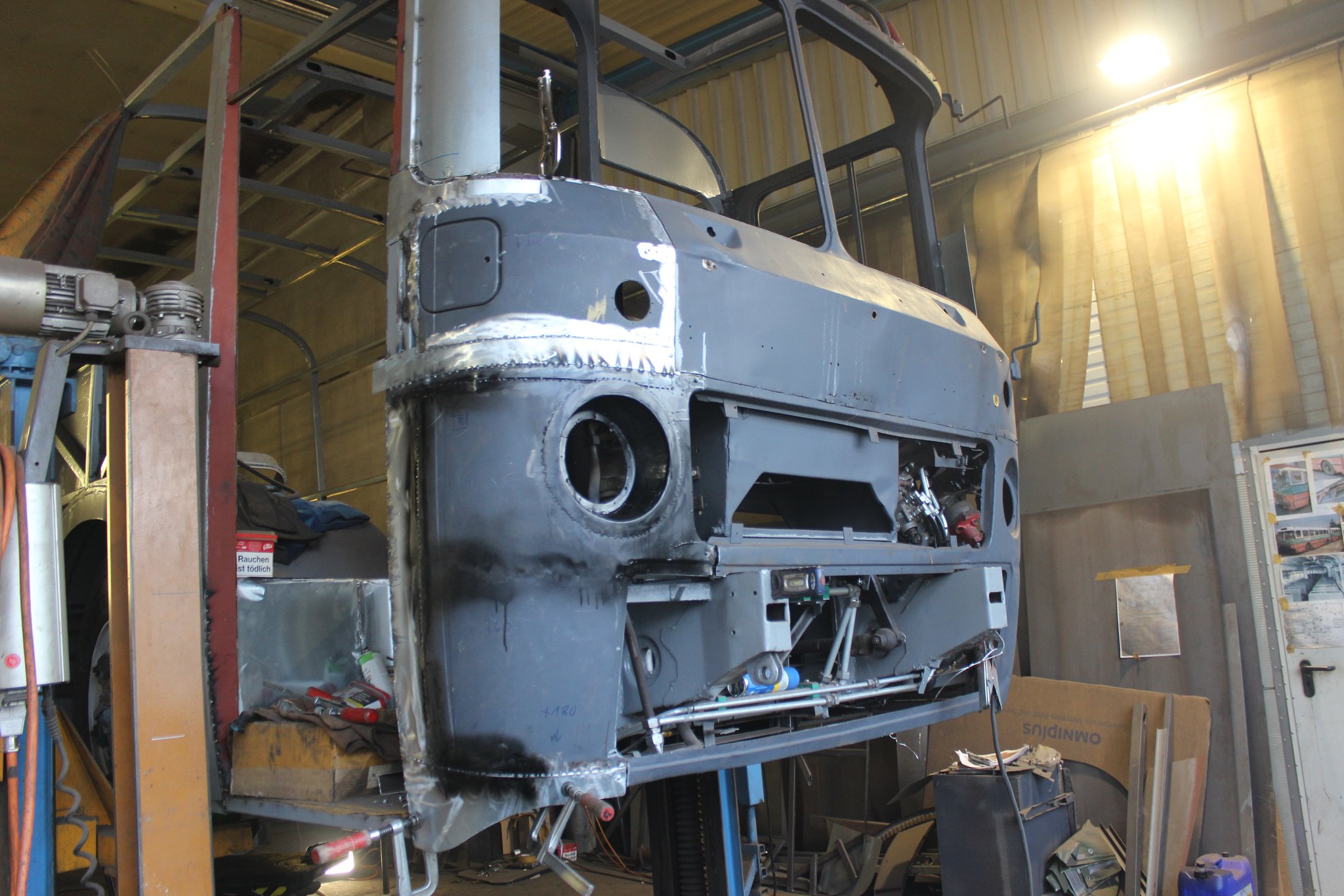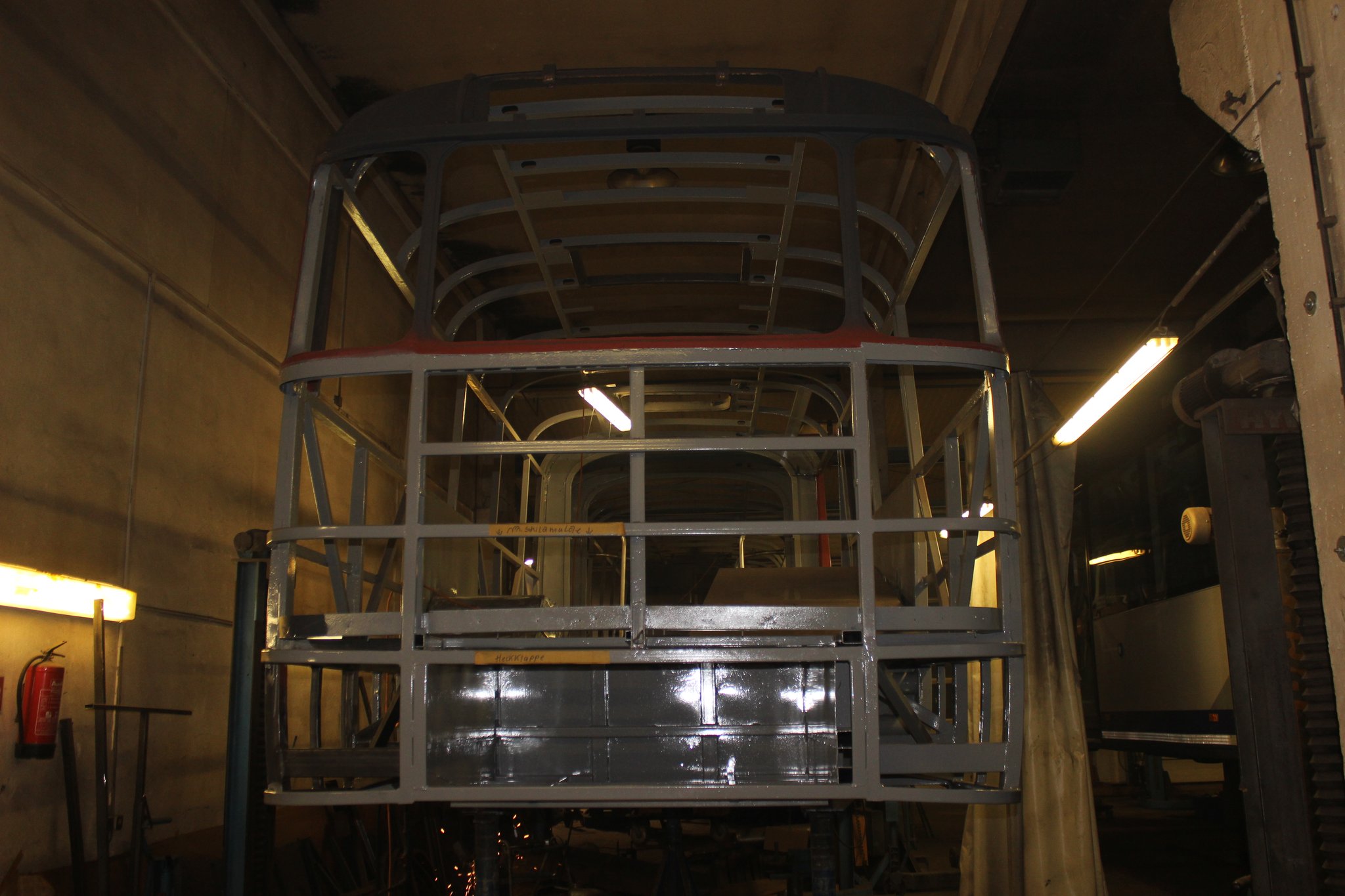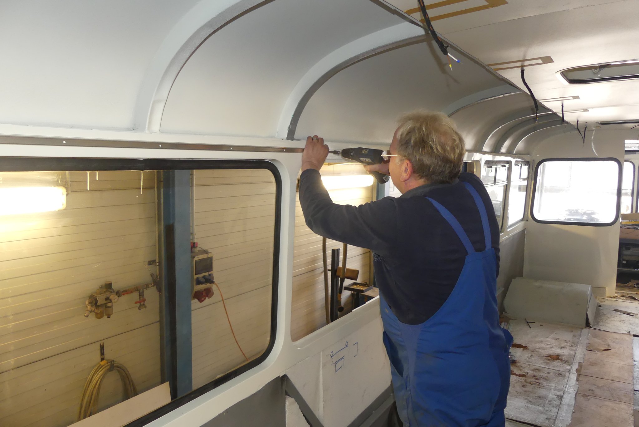 04.02.2022 - Einbau der Fußbodenplatten; Türaufnahme Tür 1 und 2; Neuanfertigung der Klappenstützen; Instandsetzung sowie Montage des Dachendblech mit Zielschildeinsatz; Instandsetzung des Fahrerfensters; Instandsetzung Stoßfänger vorn; Fahrzeugisolierung; neu angefertigte Scheibenaufnahmen einschweißen