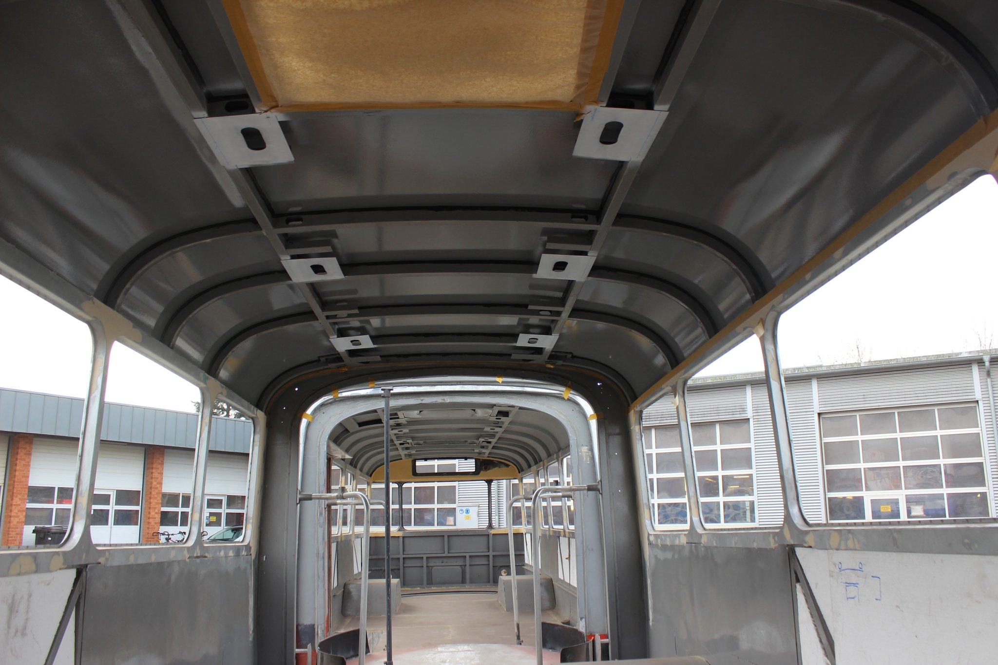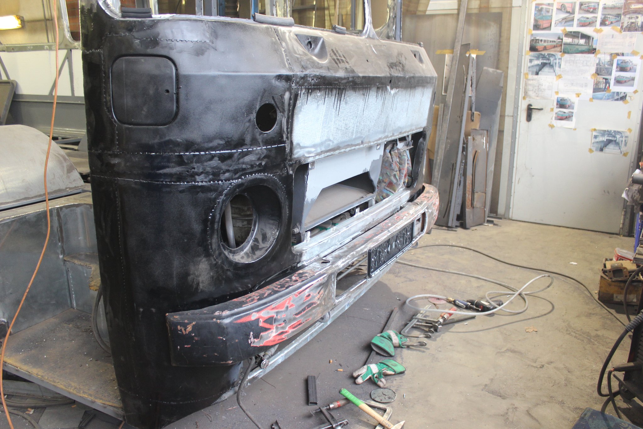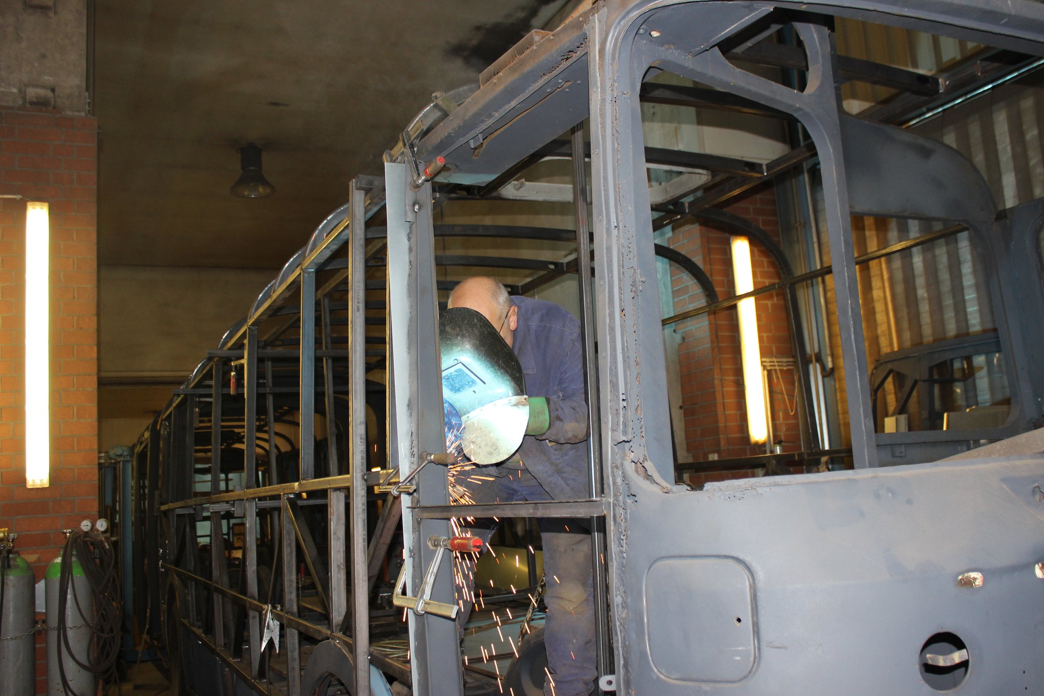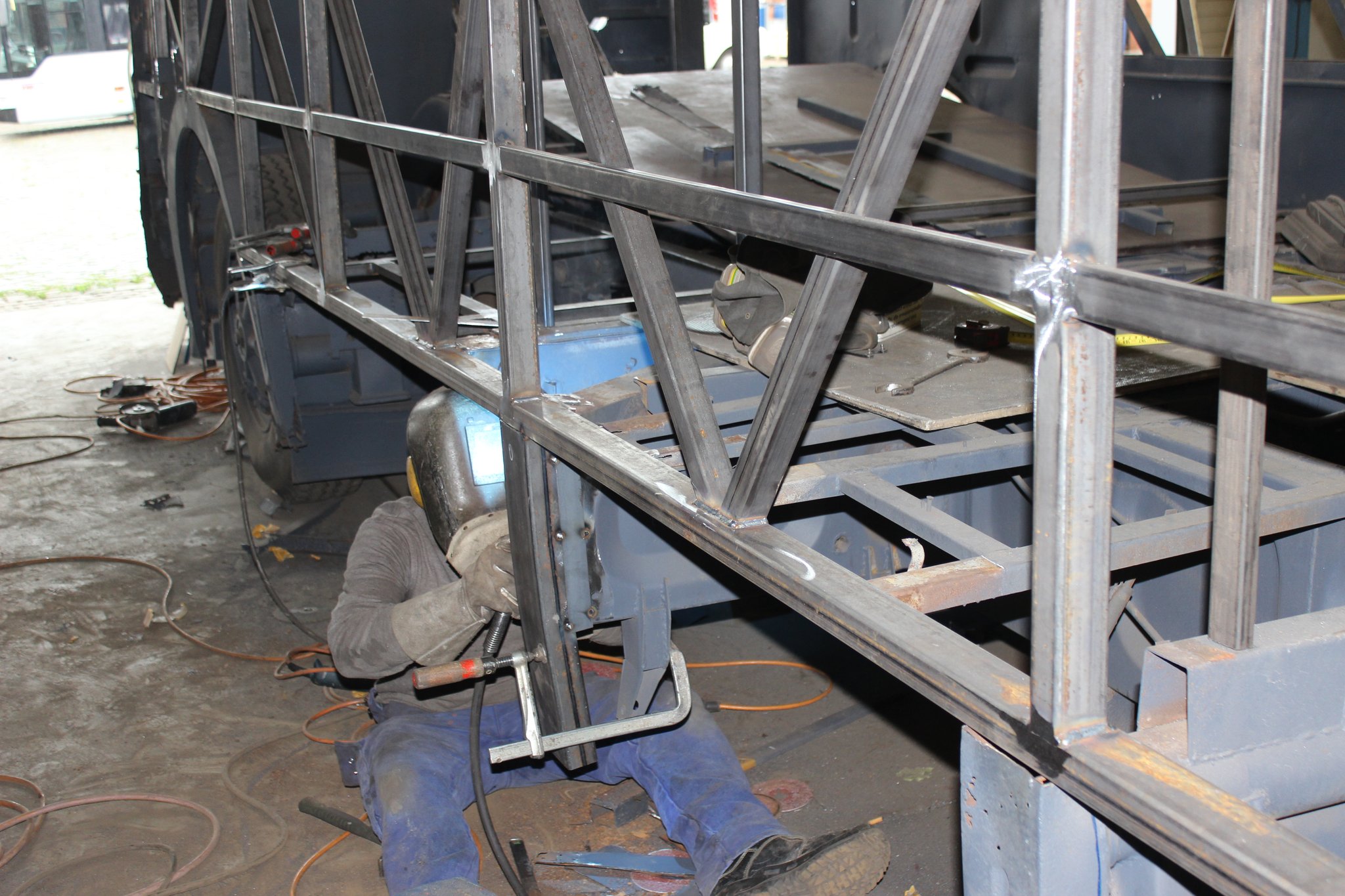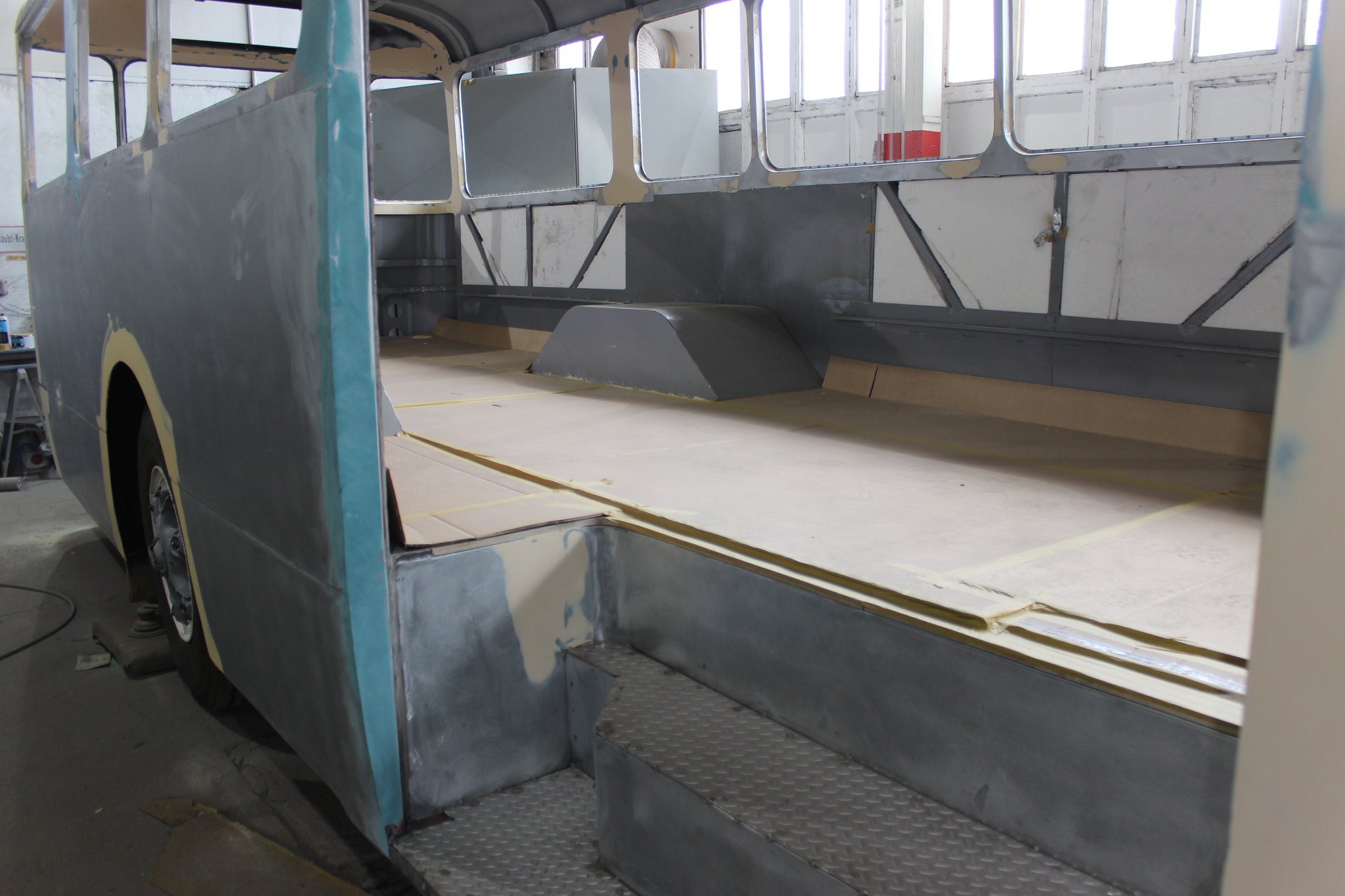 04.02.2022 - Einbau der Fußbodenplatten; Türaufnahme Tür 1 und 2; Neuanfertigung der Klappenstützen; Instandsetzung sowie Montage des Dachendblech mit Zielschildeinsatz; Instandsetzung des Fahrerfensters; Instandsetzung Stoßfänger vorn; Fahrzeugisolierung; neu angefertigte Scheibenaufnahmen einschweißen