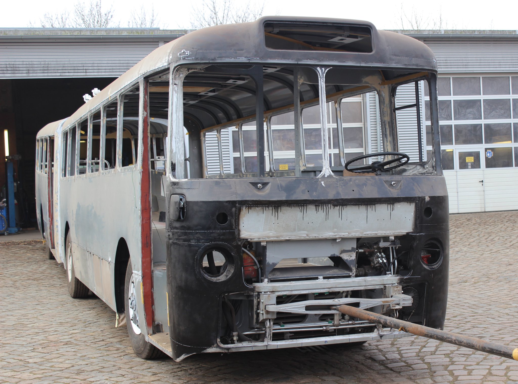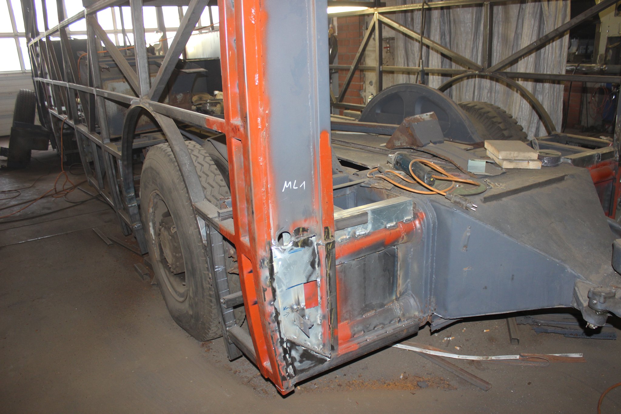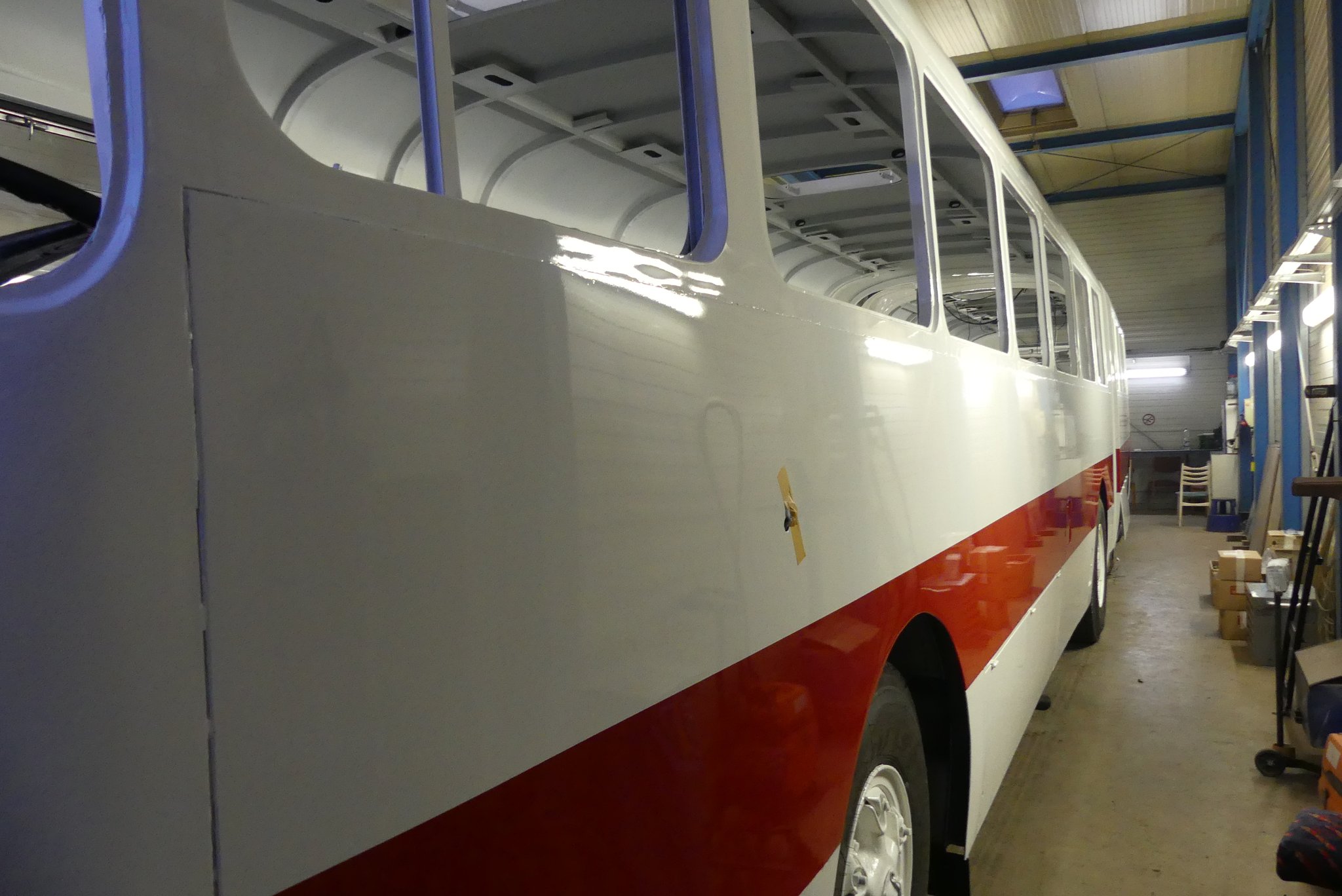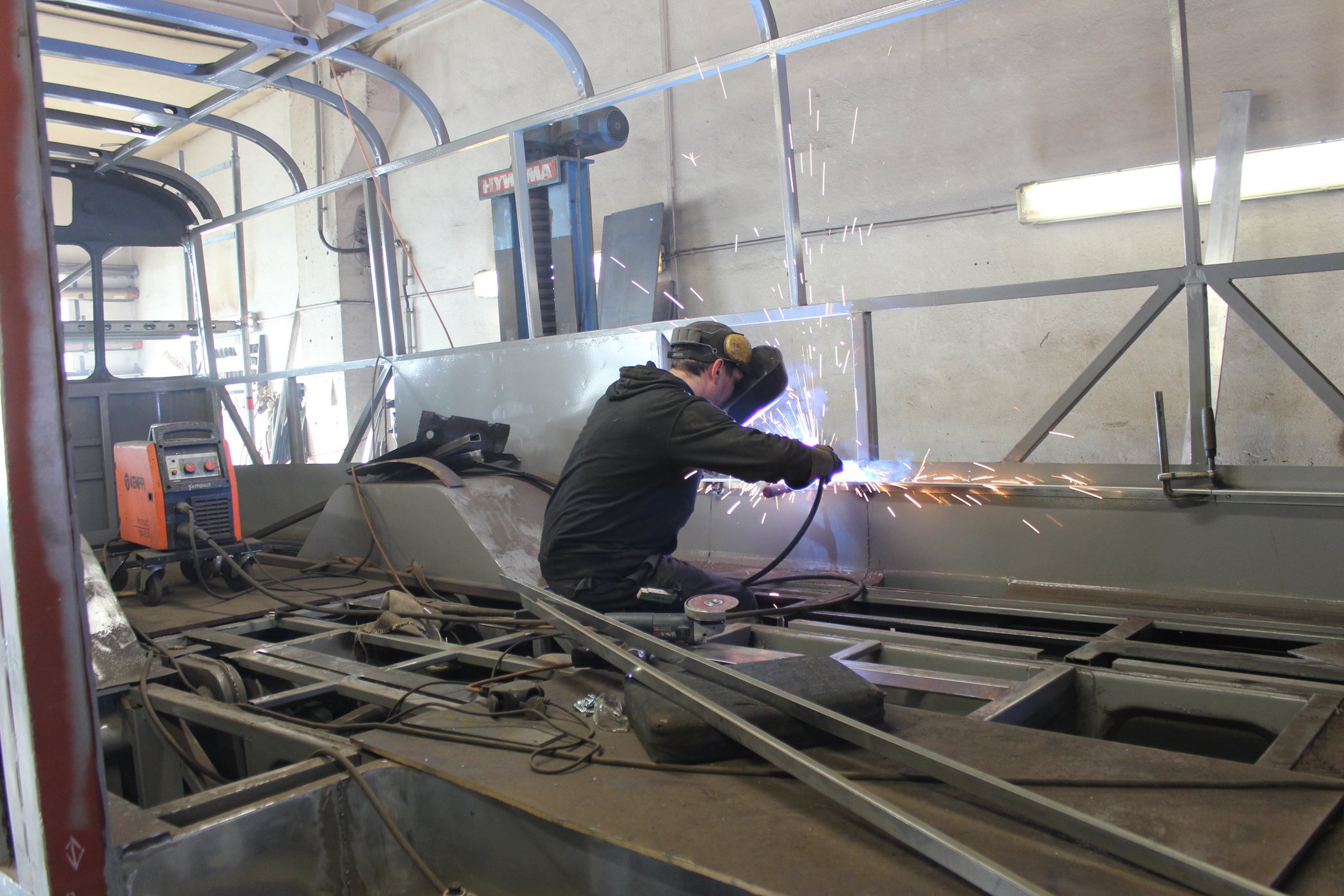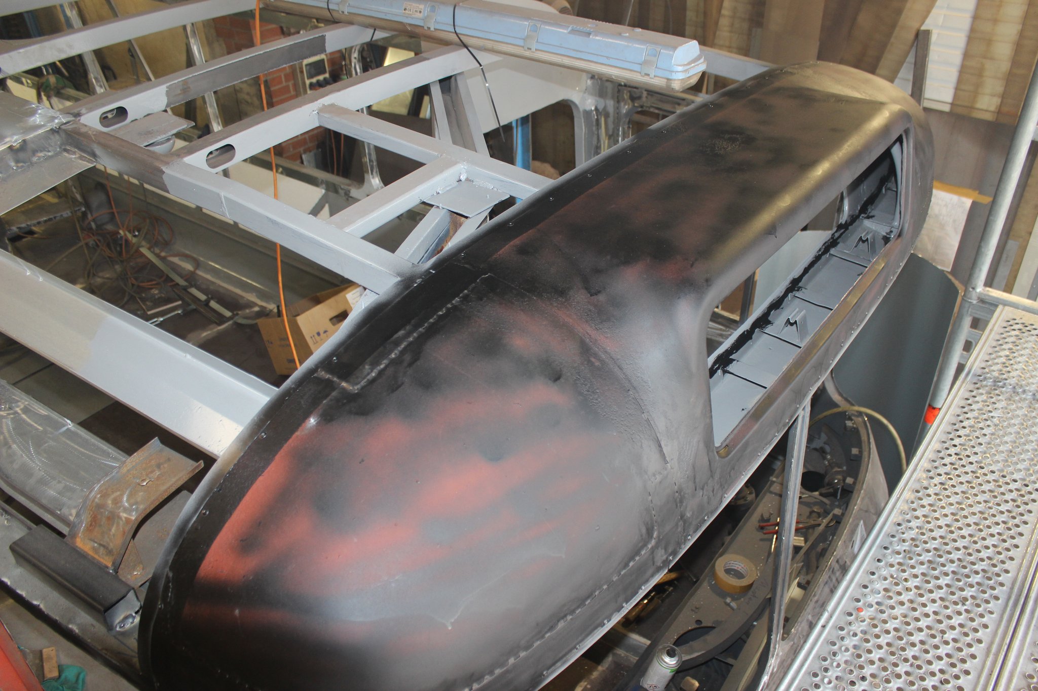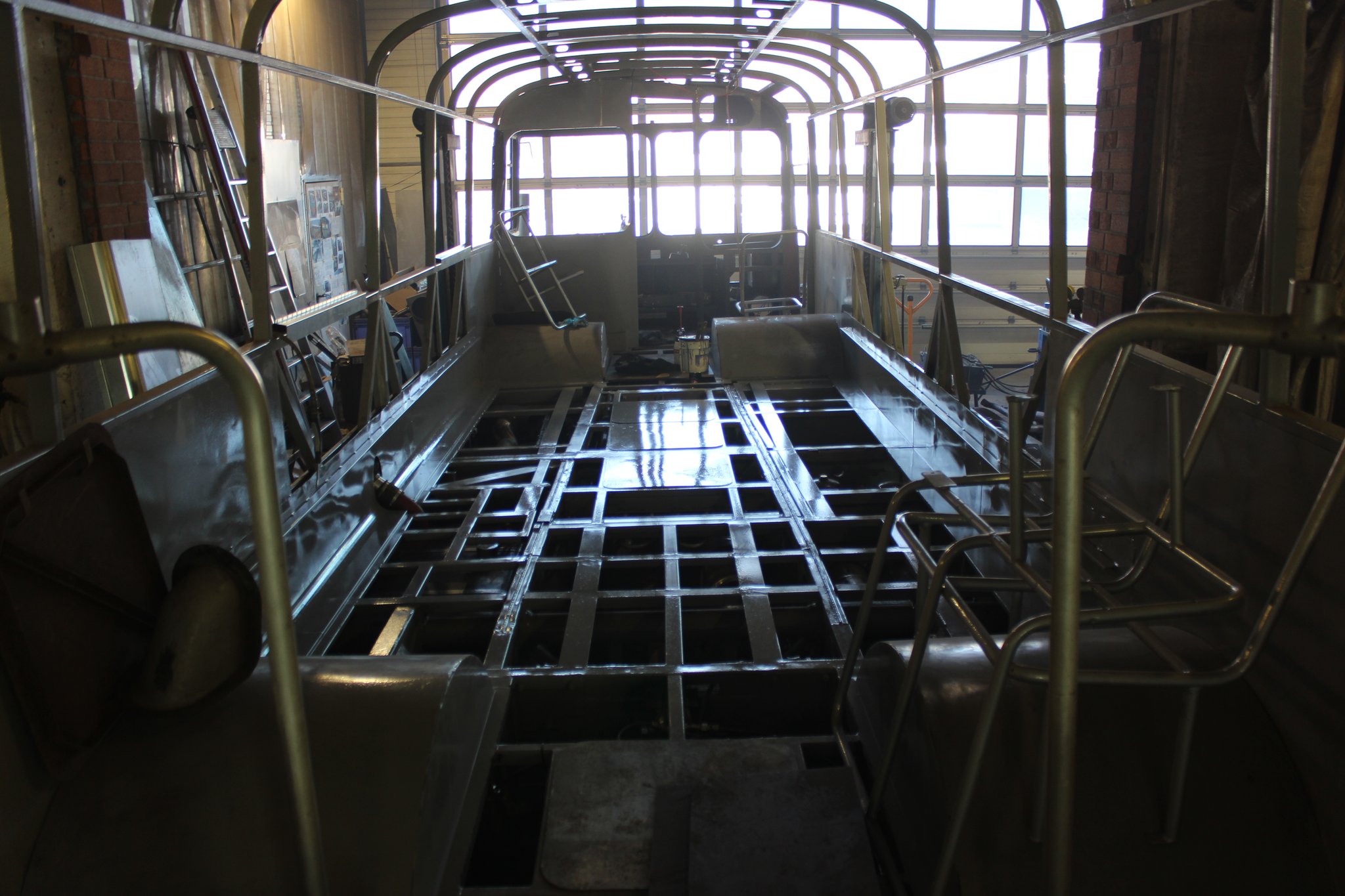 04.02.2022 - Einbau der Fußbodenplatten; Türaufnahme Tür 1 und 2; Neuanfertigung der Klappenstützen; Instandsetzung sowie Montage des Dachendblech mit Zielschildeinsatz; Instandsetzung des Fahrerfensters; Instandsetzung Stoßfänger vorn; Fahrzeugisolierung; neu angefertigte Scheibenaufnahmen einschweißen
