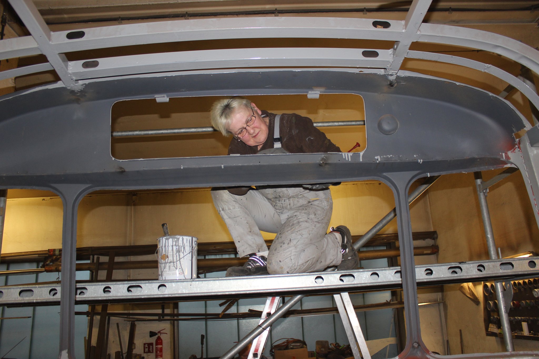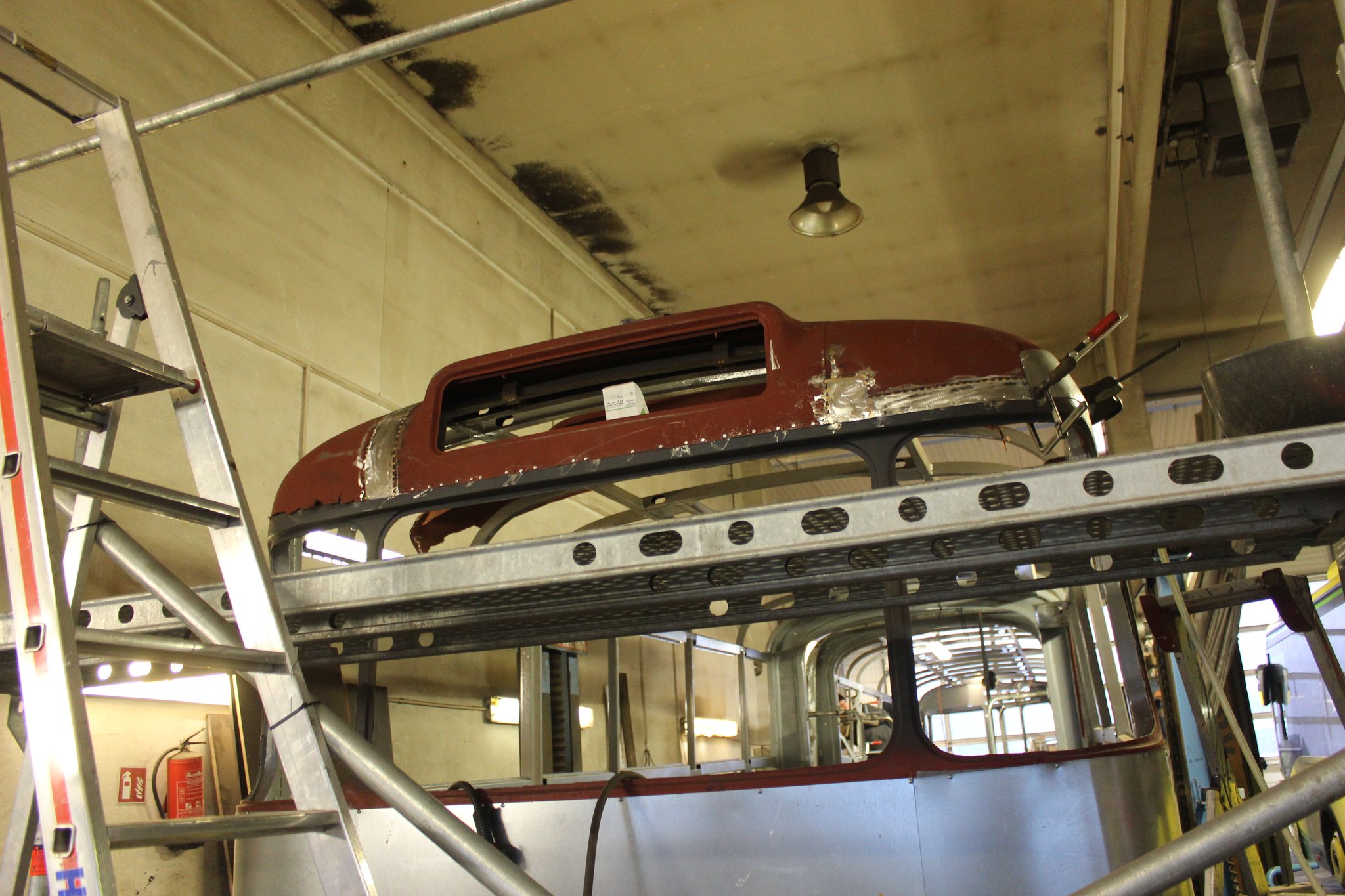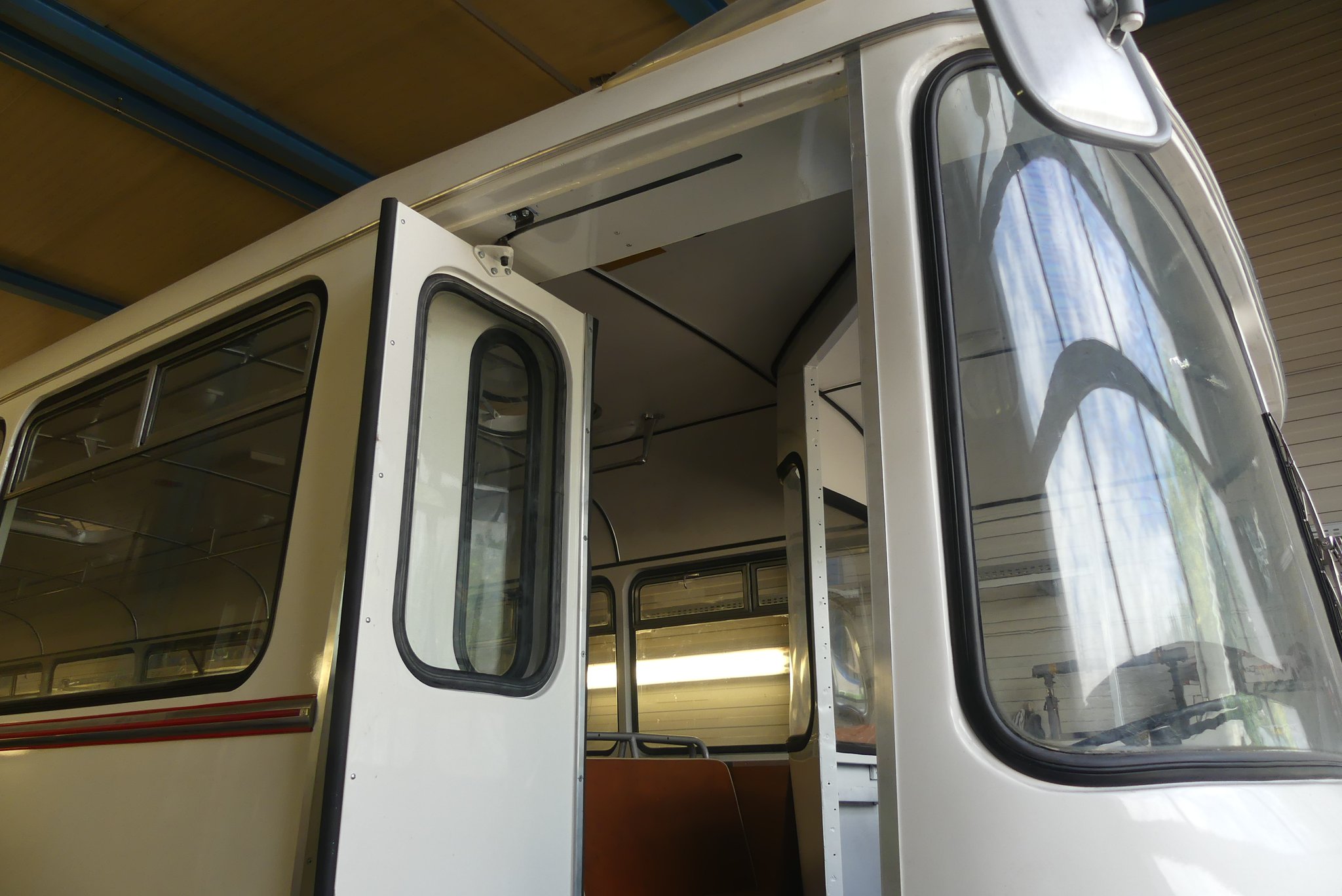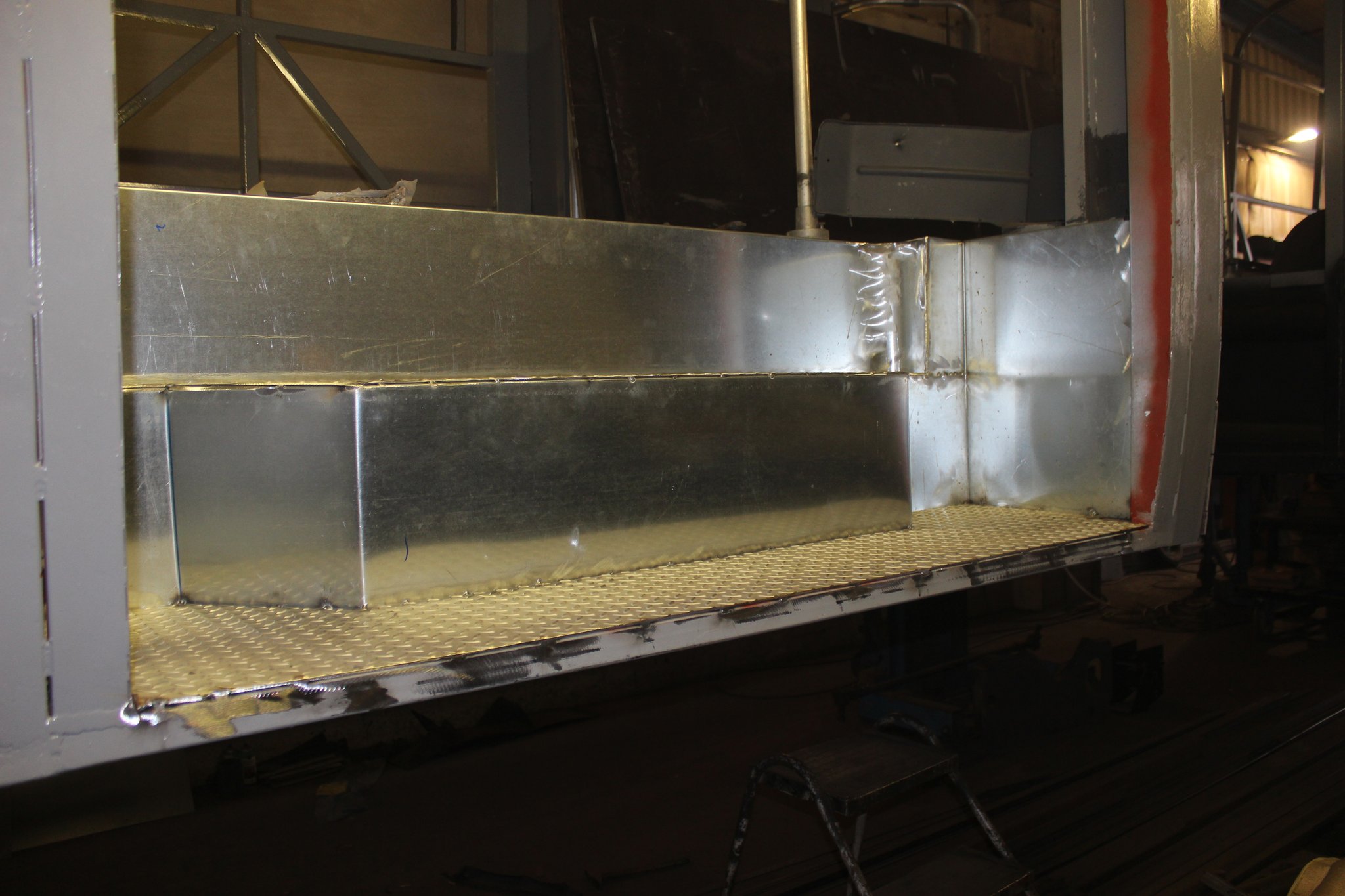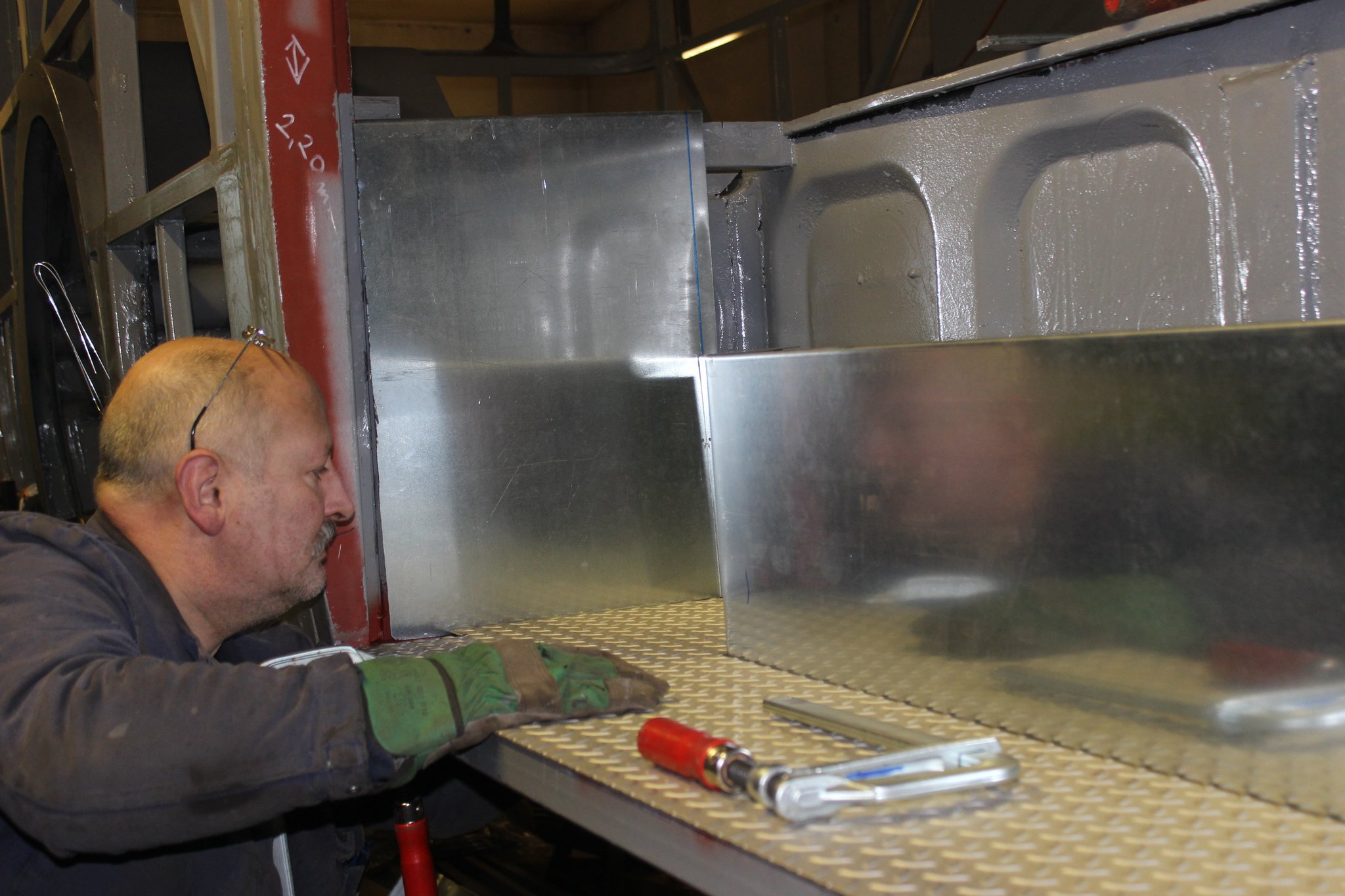 04.02.2022 - Einbau der Fußbodenplatten; Türaufnahme Tür 1 und 2; Neuanfertigung der Klappenstützen; Instandsetzung sowie Montage des Dachendblech mit Zielschildeinsatz; Instandsetzung des Fahrerfensters; Instandsetzung Stoßfänger vorn; Fahrzeugisolierung; neu angefertigte Scheibenaufnahmen einschweißen