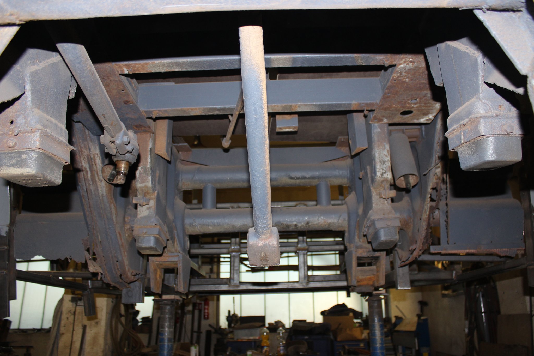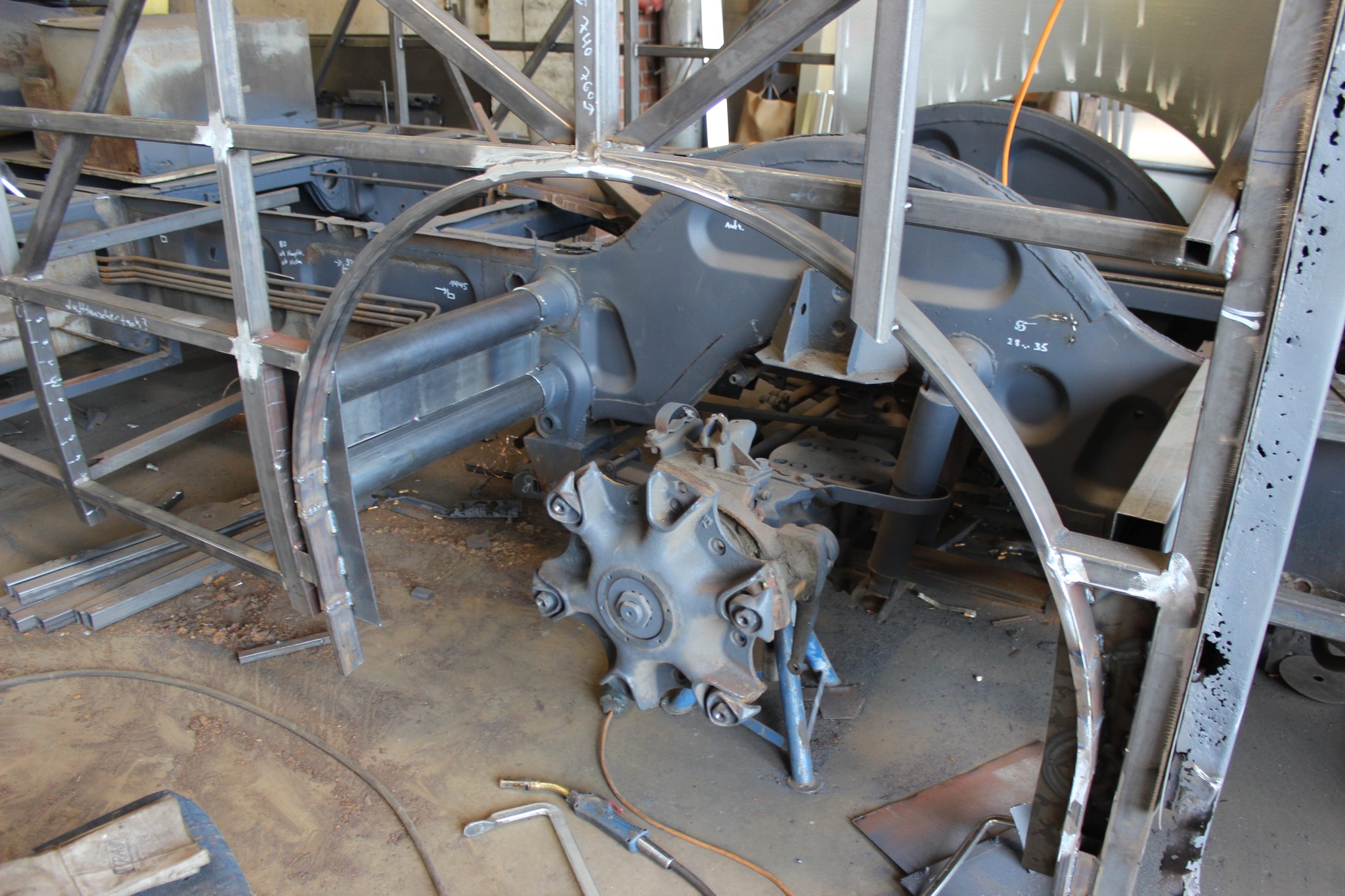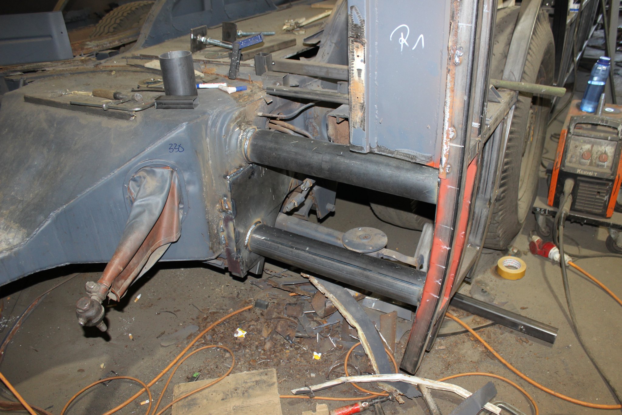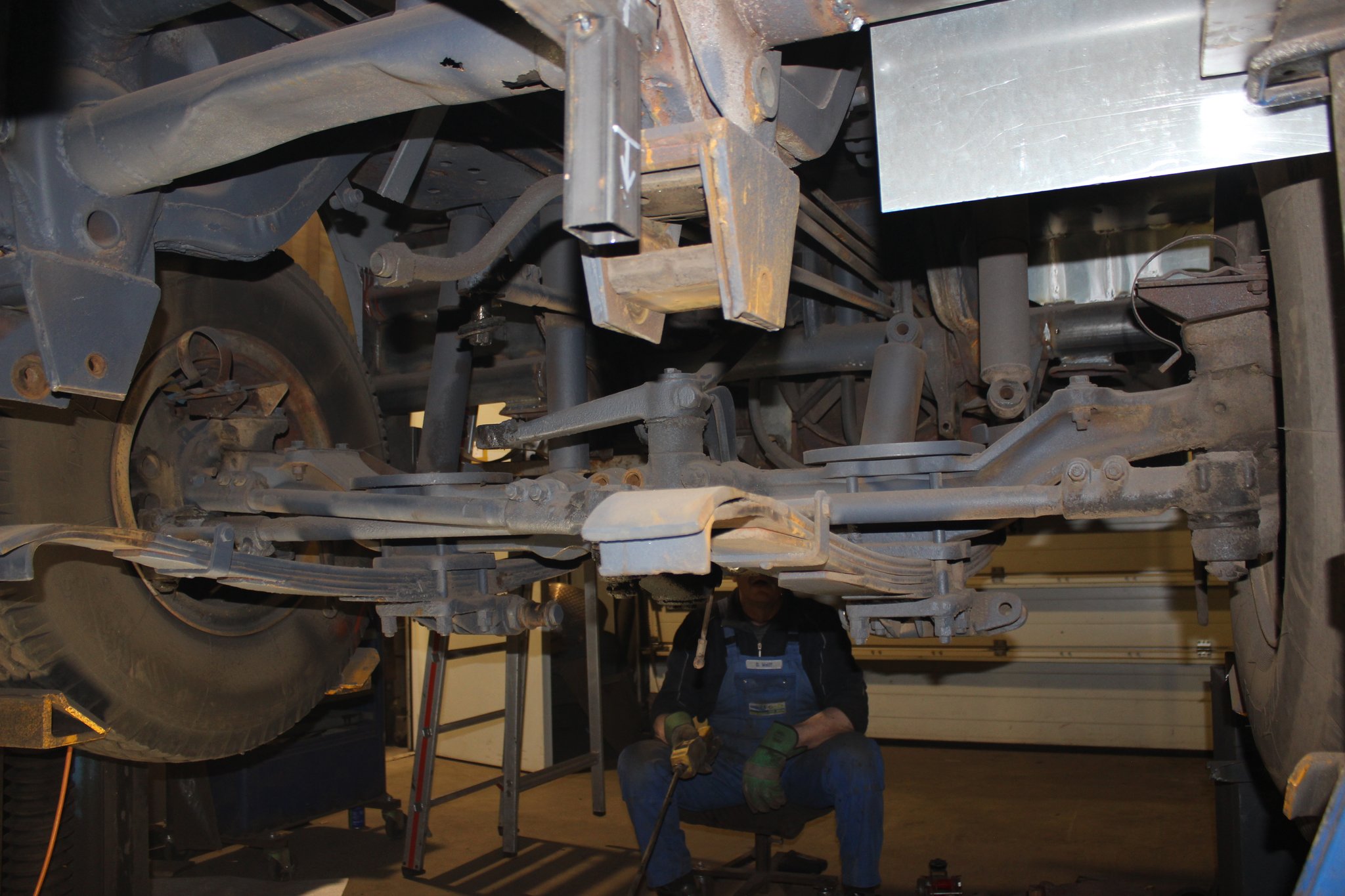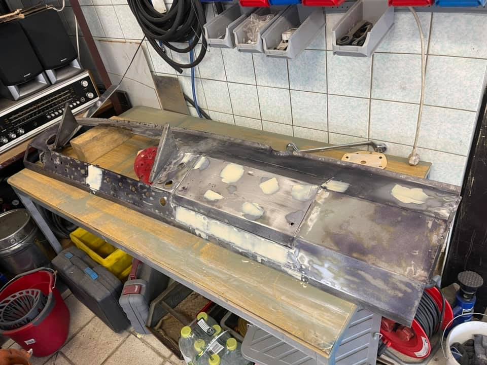 21.01.2022 - Instandsetzung Mittelrahmen sowie Vormontage; Aufarbeitung des Frontgerippes sowie der Frontmaske; Montage der Sitzhalteschienen; Einbau der Gelenkwelle mit Zwischenlager, des Endschalldämpfers und des Luftfilters
