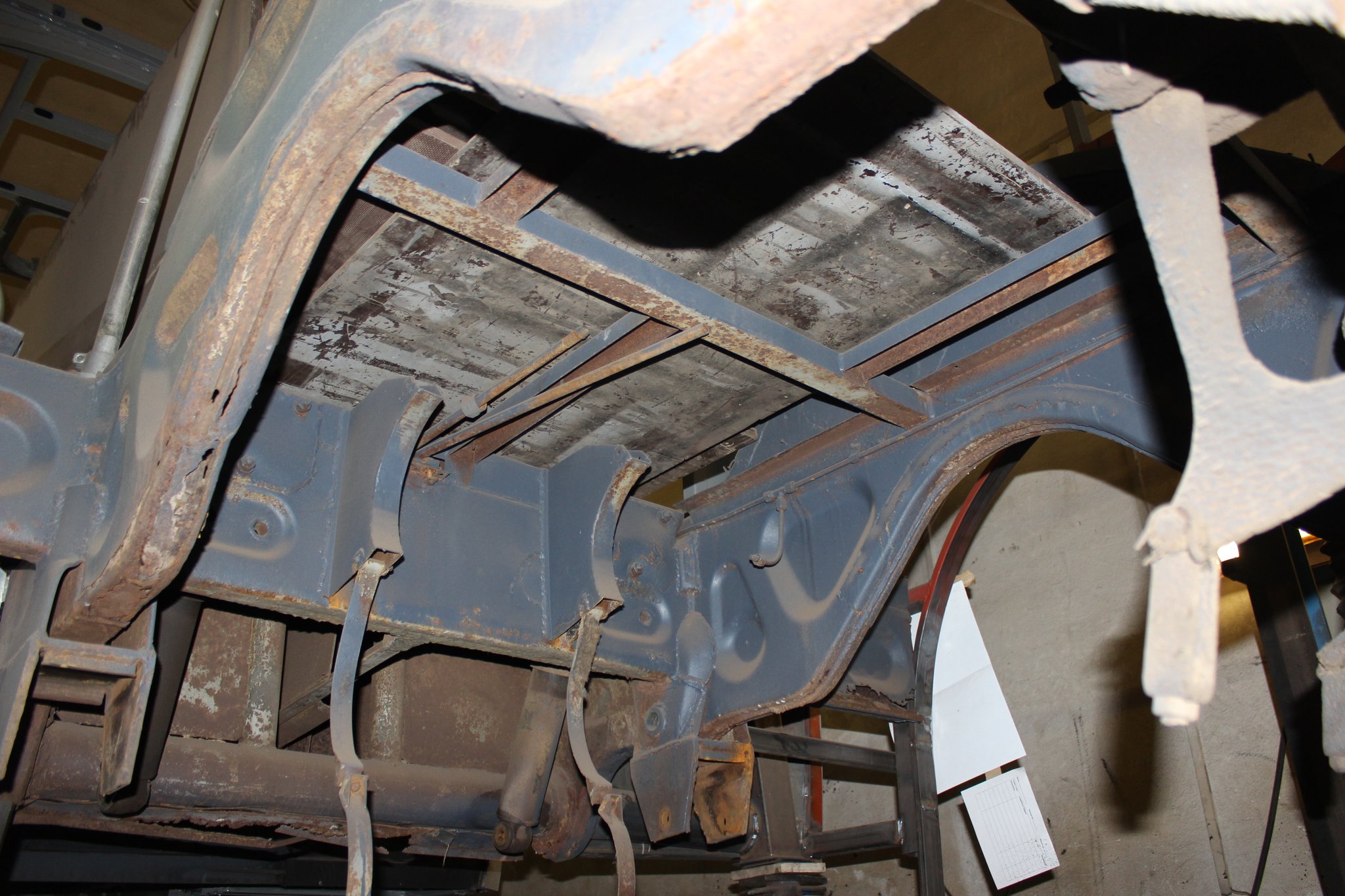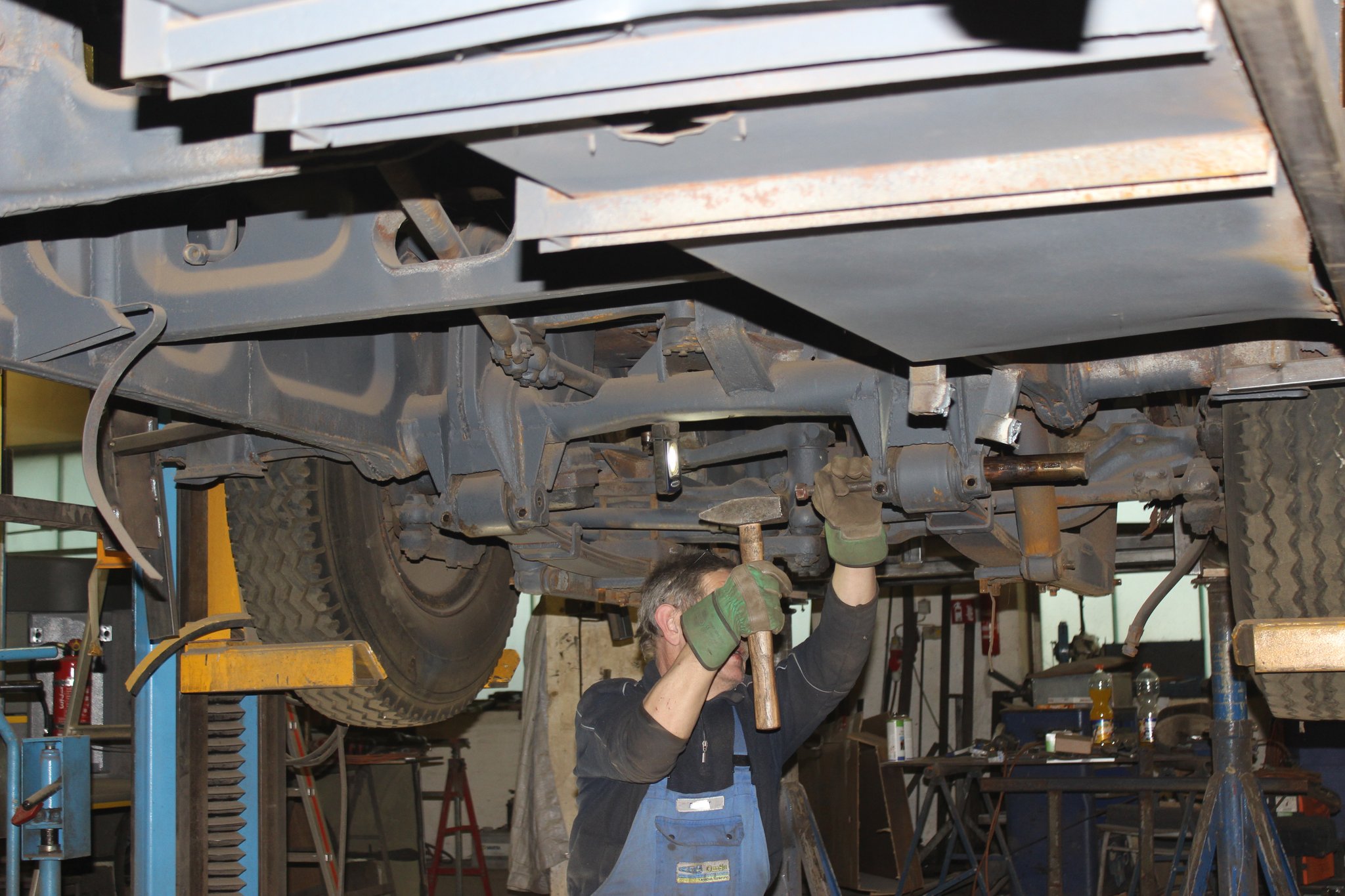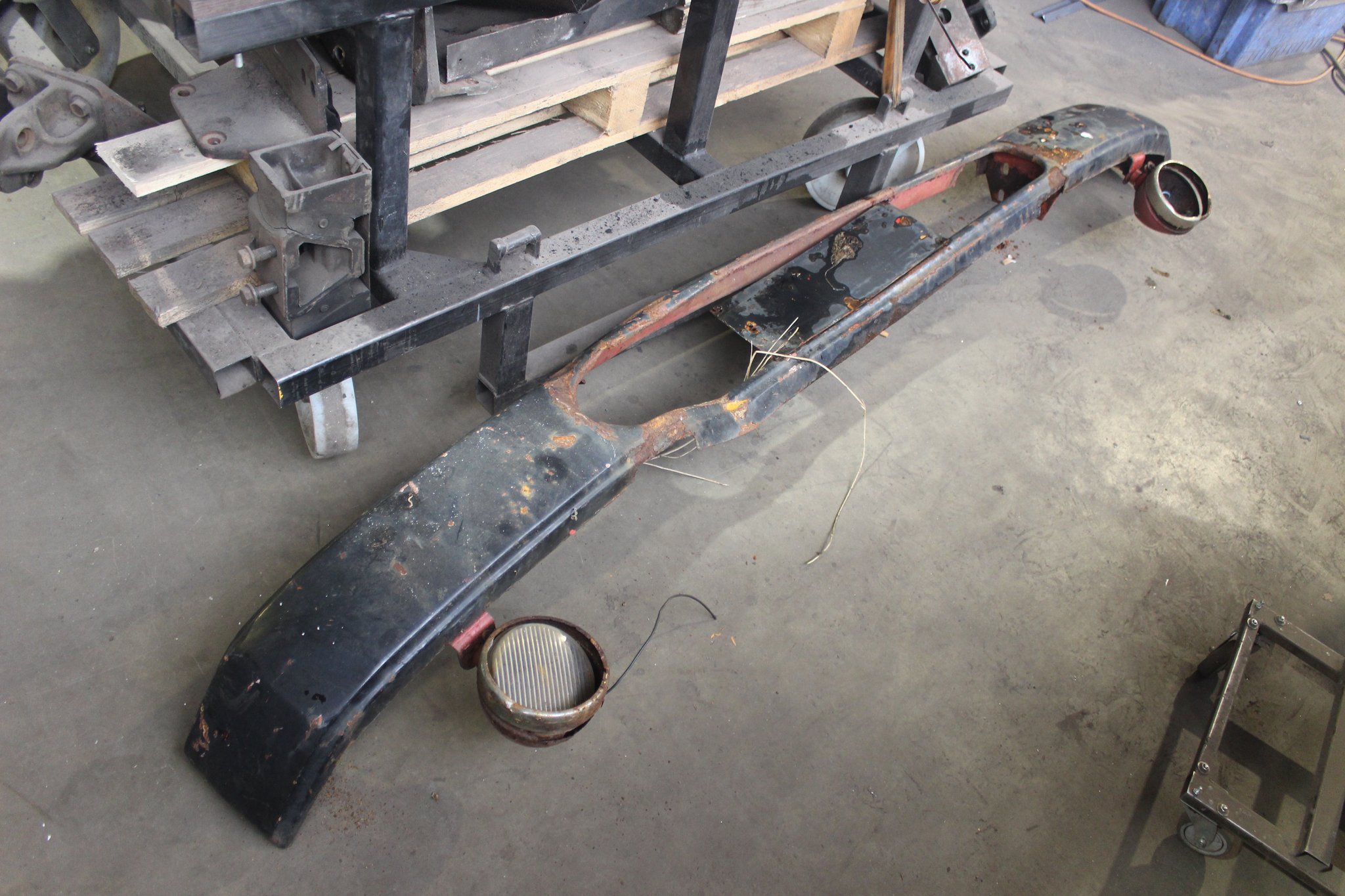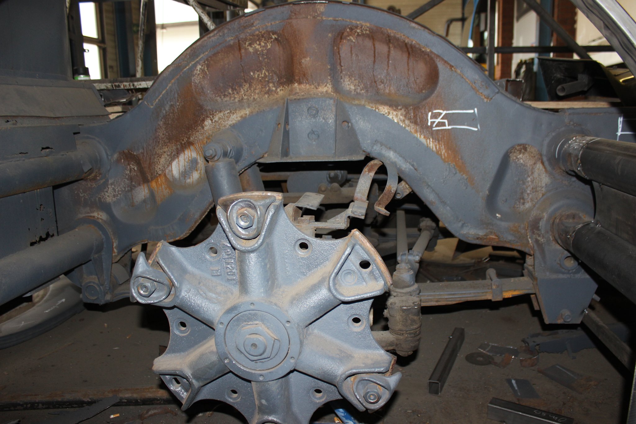 21.01.2022 - Instandsetzung Mittelrahmen sowie Vormontage; Aufarbeitung des Frontgerippes sowie der Frontmaske; Montage der Sitzhalteschienen; Einbau der Gelenkwelle mit Zwischenlager, des Endschalldämpfers und des Luftfilters
