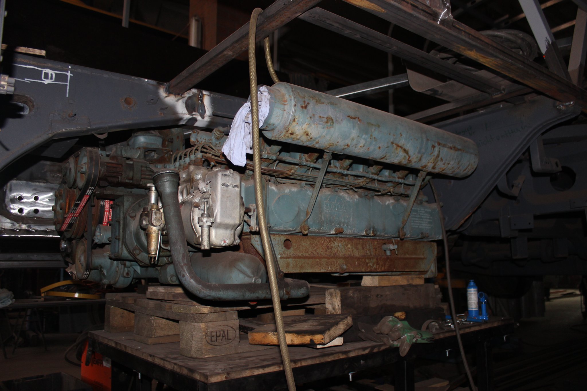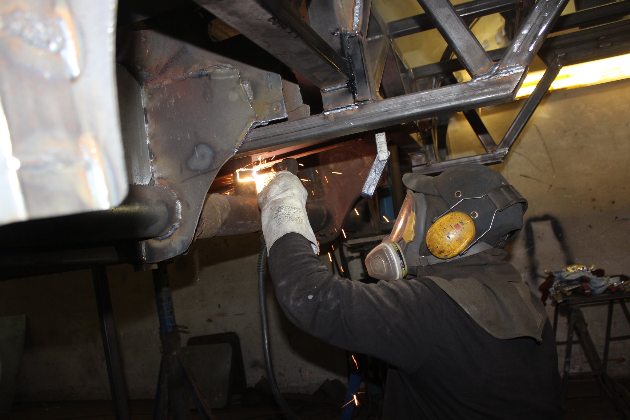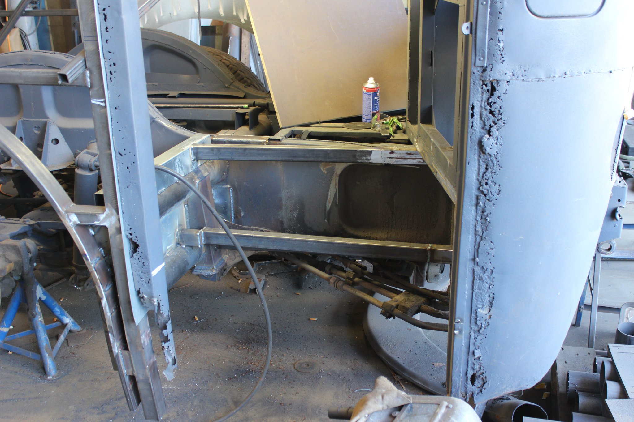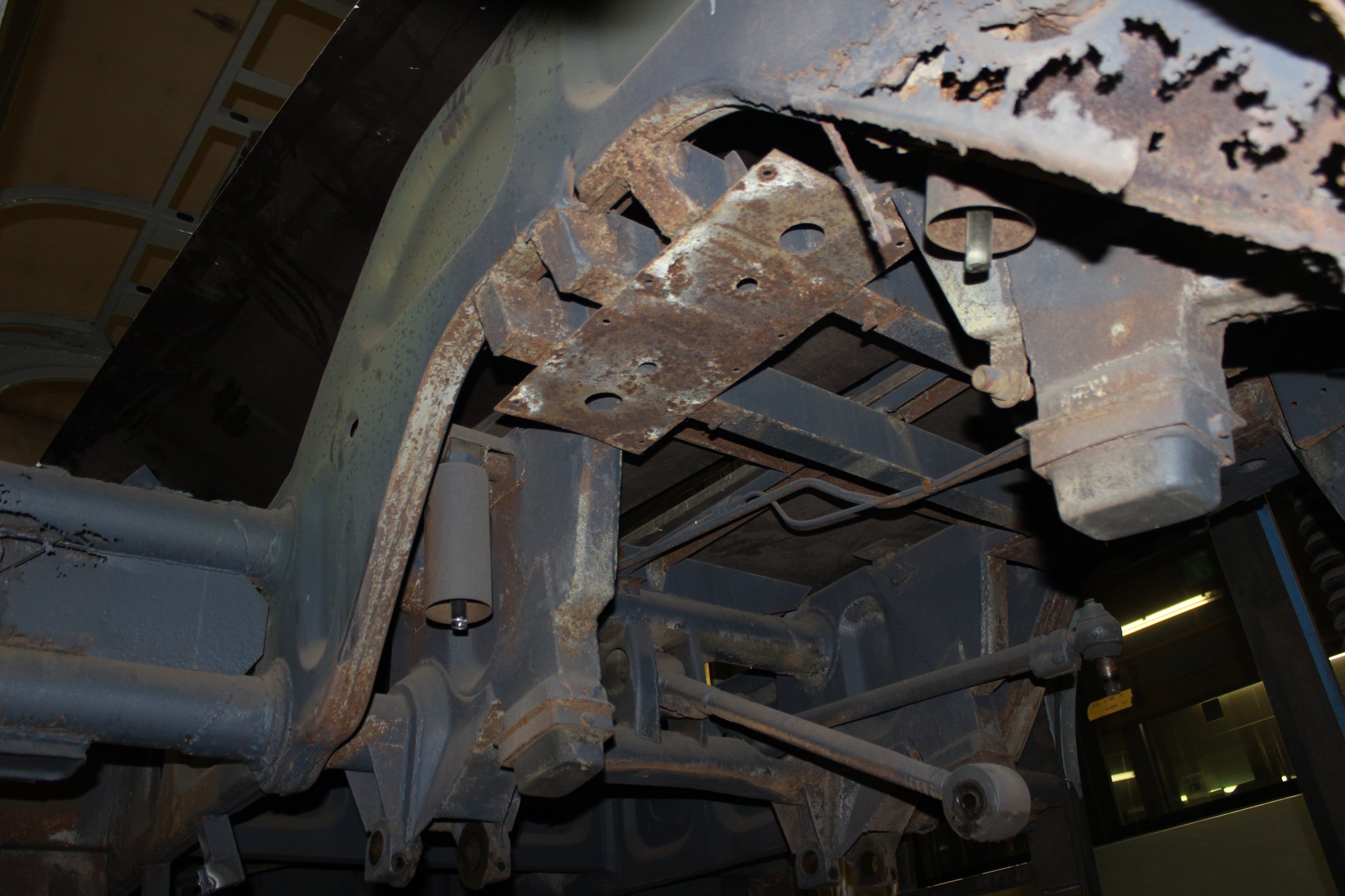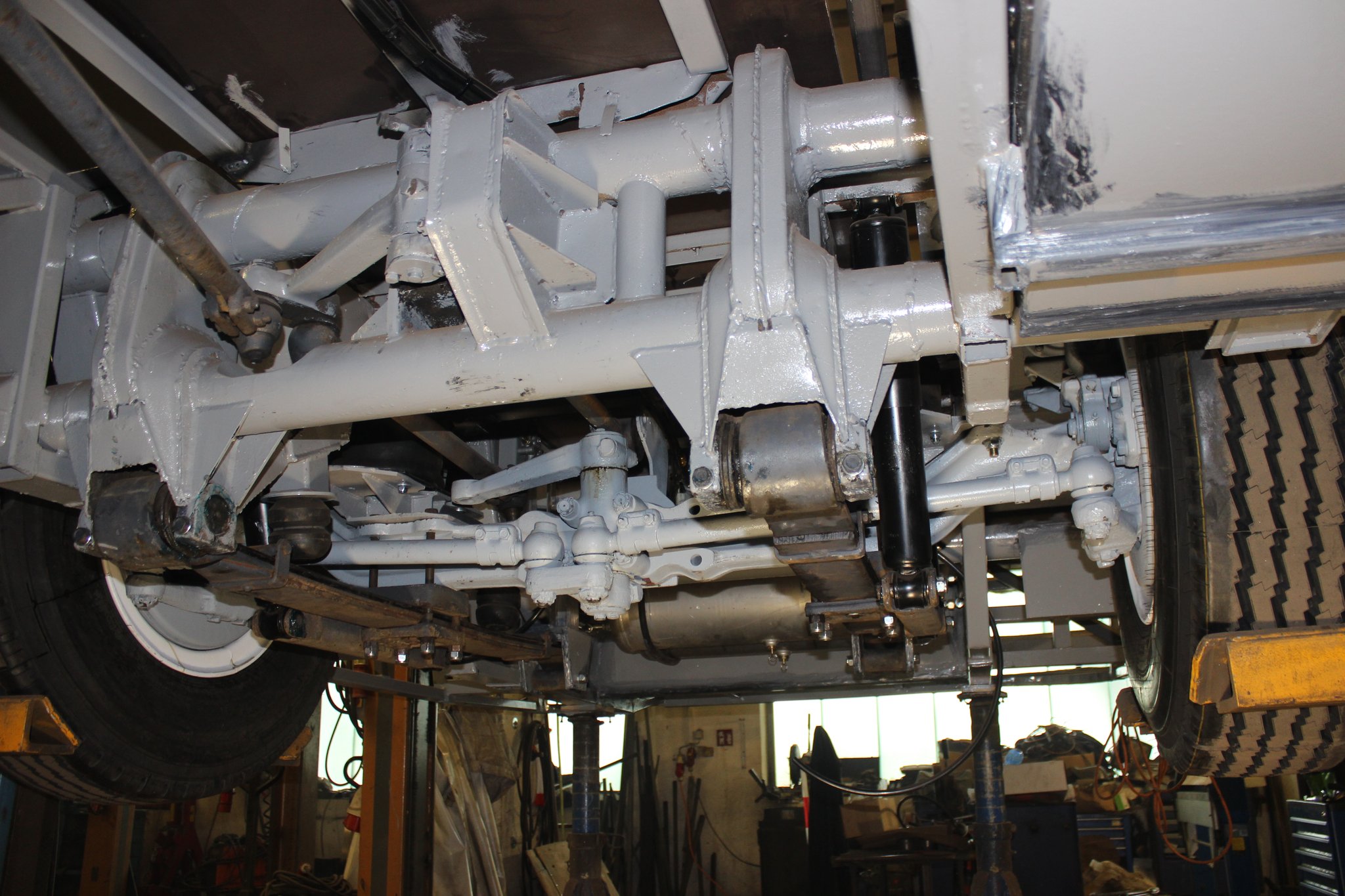 21.01.2022 - Instandsetzung Mittelrahmen sowie Vormontage; Aufarbeitung des Frontgerippes sowie der Frontmaske; Montage der Sitzhalteschienen; Einbau der Gelenkwelle mit Zwischenlager, des Endschalldämpfers und des Luftfilters