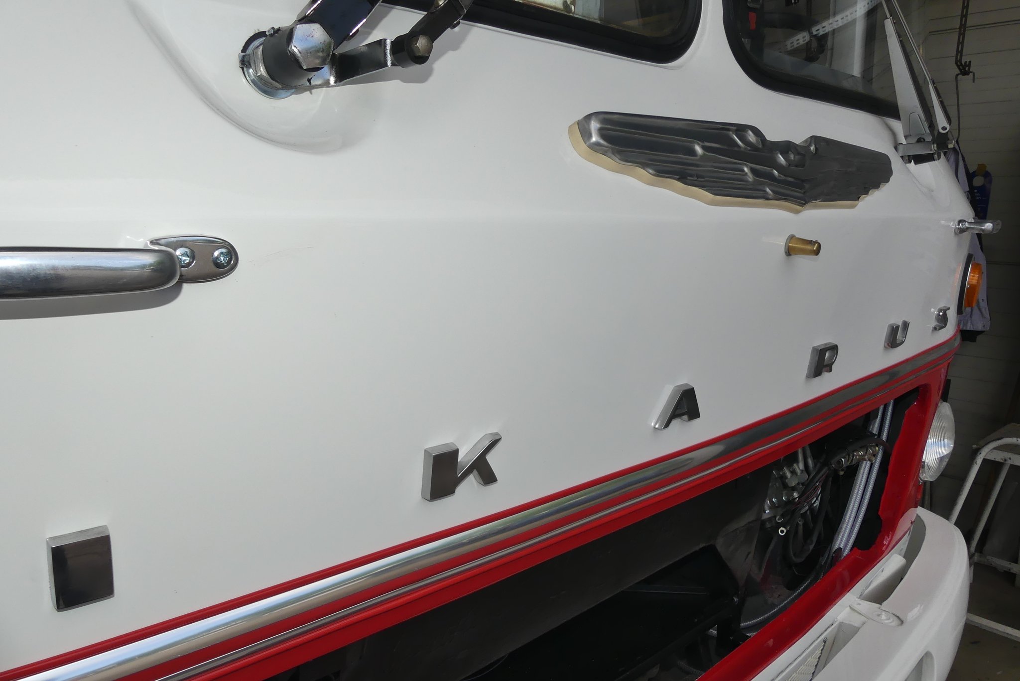 27.04.2021 - Sanierung der Armaturentafel und des Kühlergrills, Ikarus Flügel u. Ikarus Schriftzug / Aufarbeitung bzw. Neubau von Kleinteilen und der Innenbeleuchtung / Aufarbeitung der A- u. B-Achse
