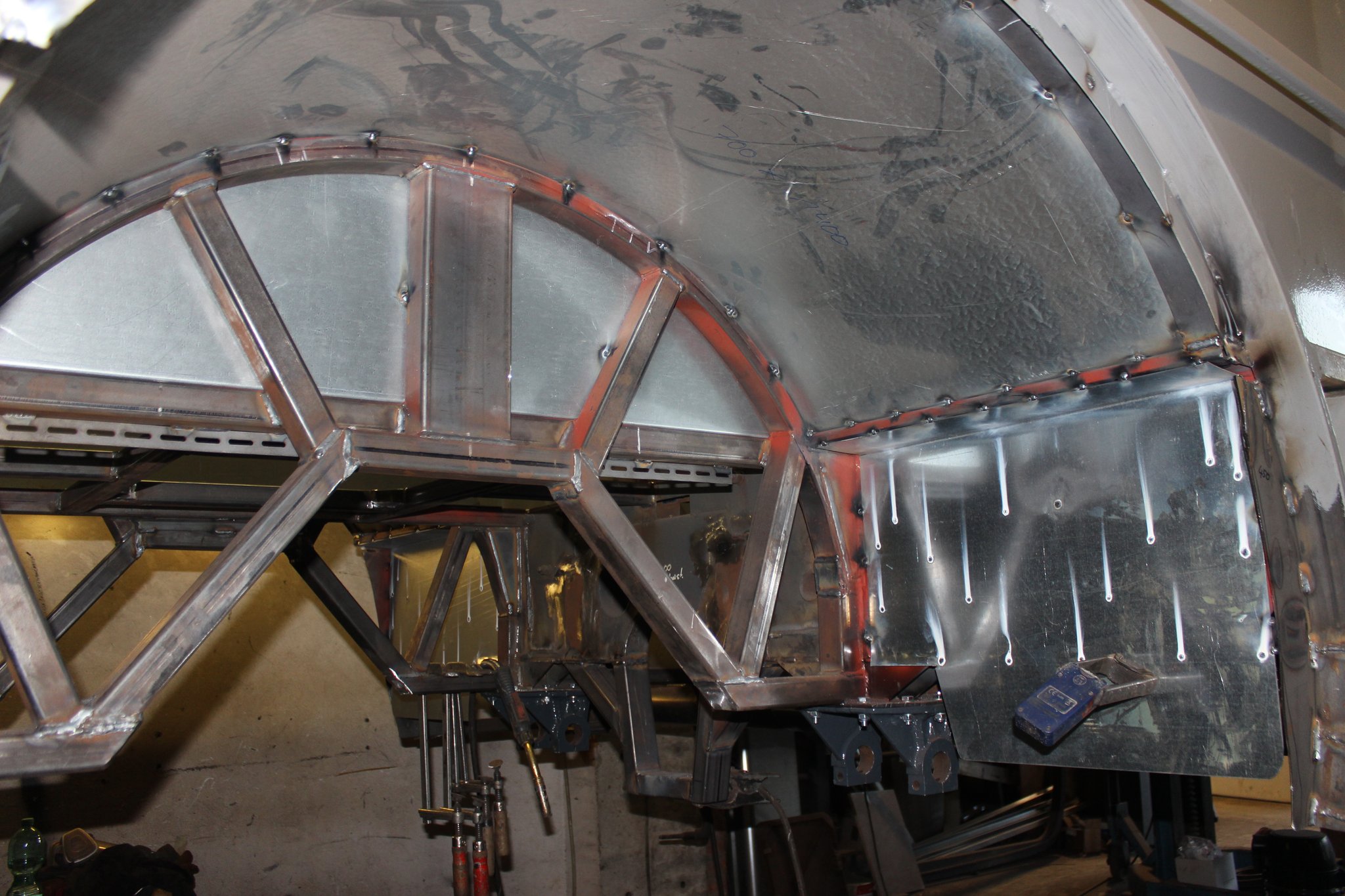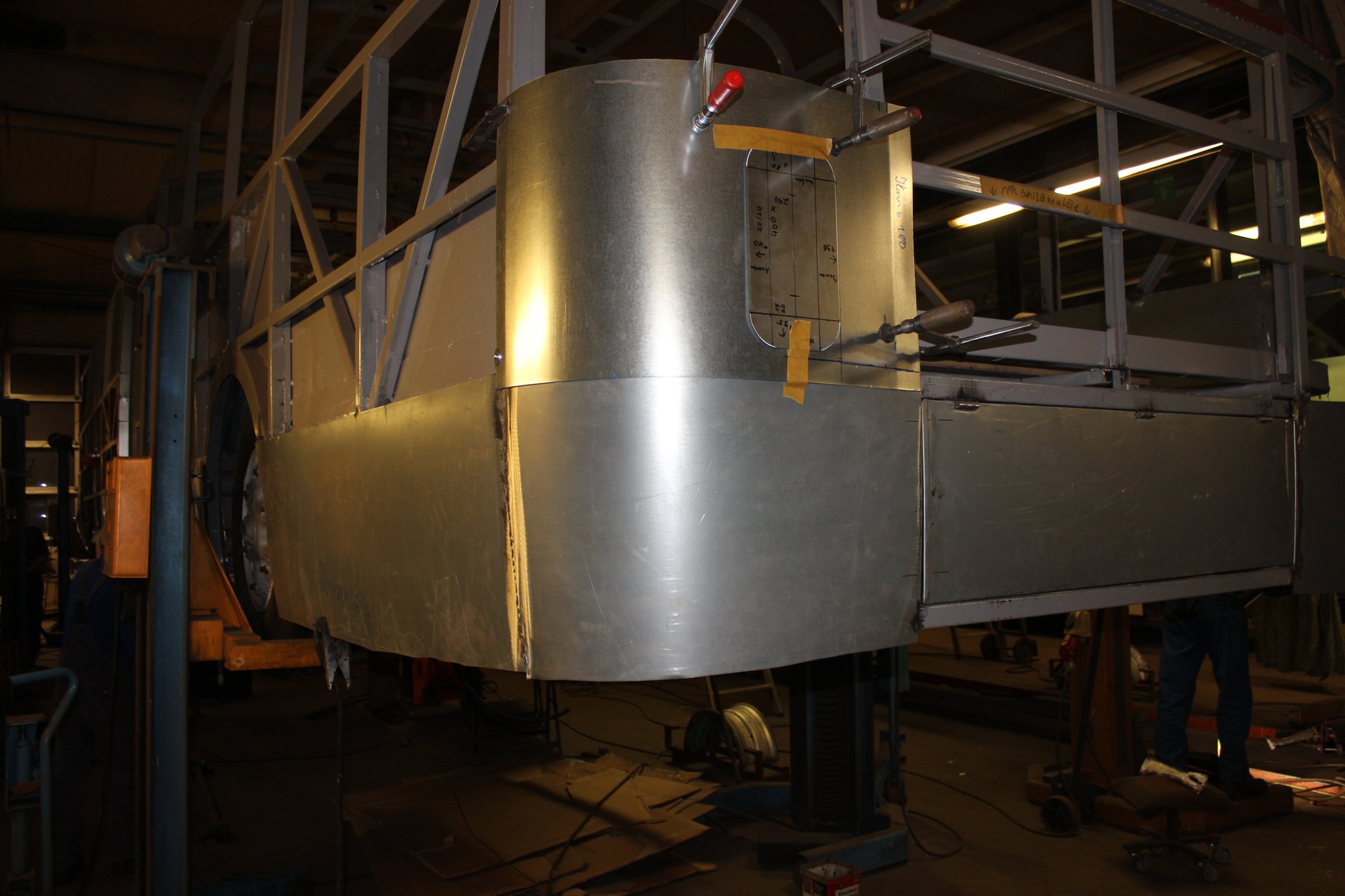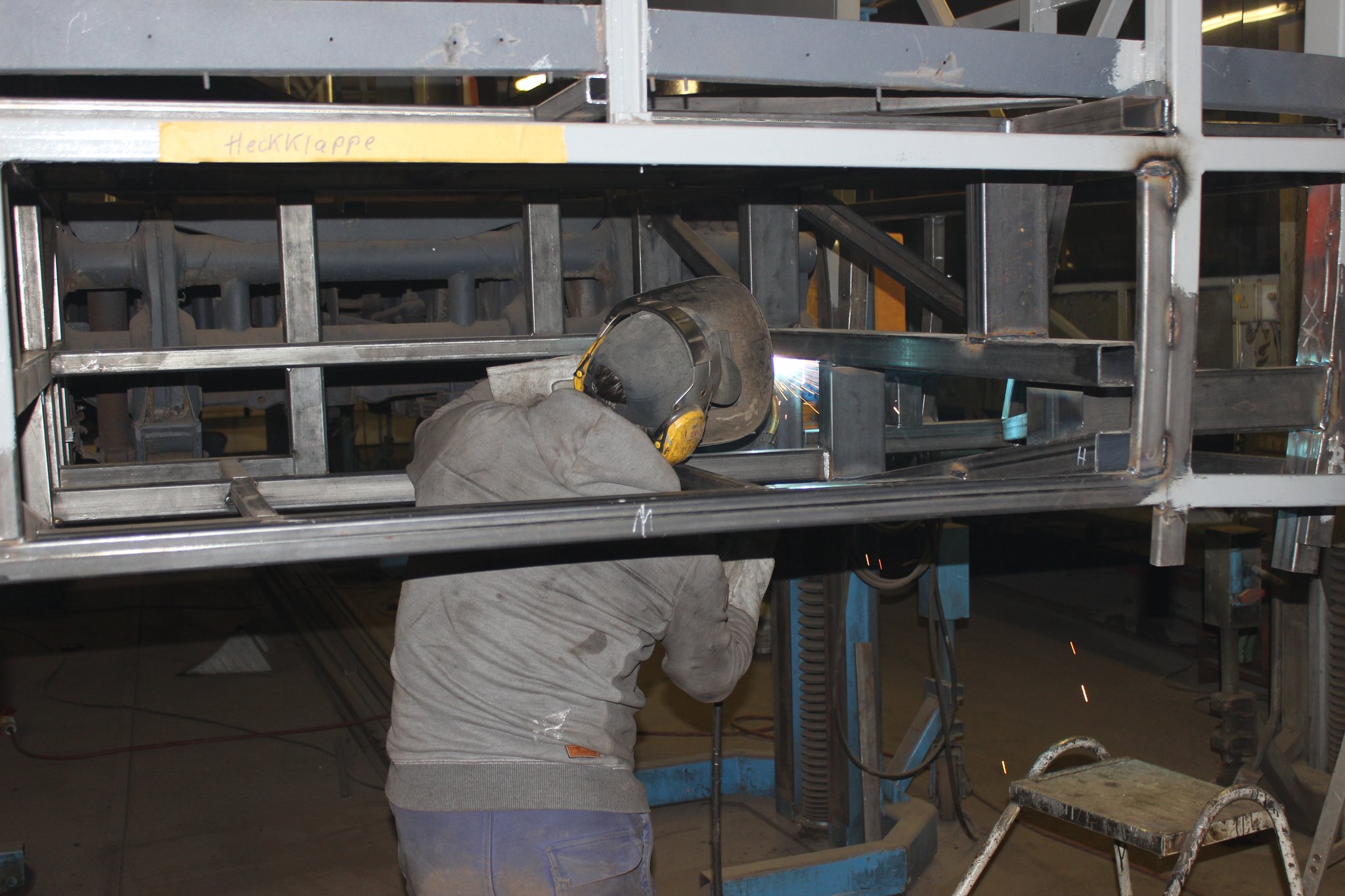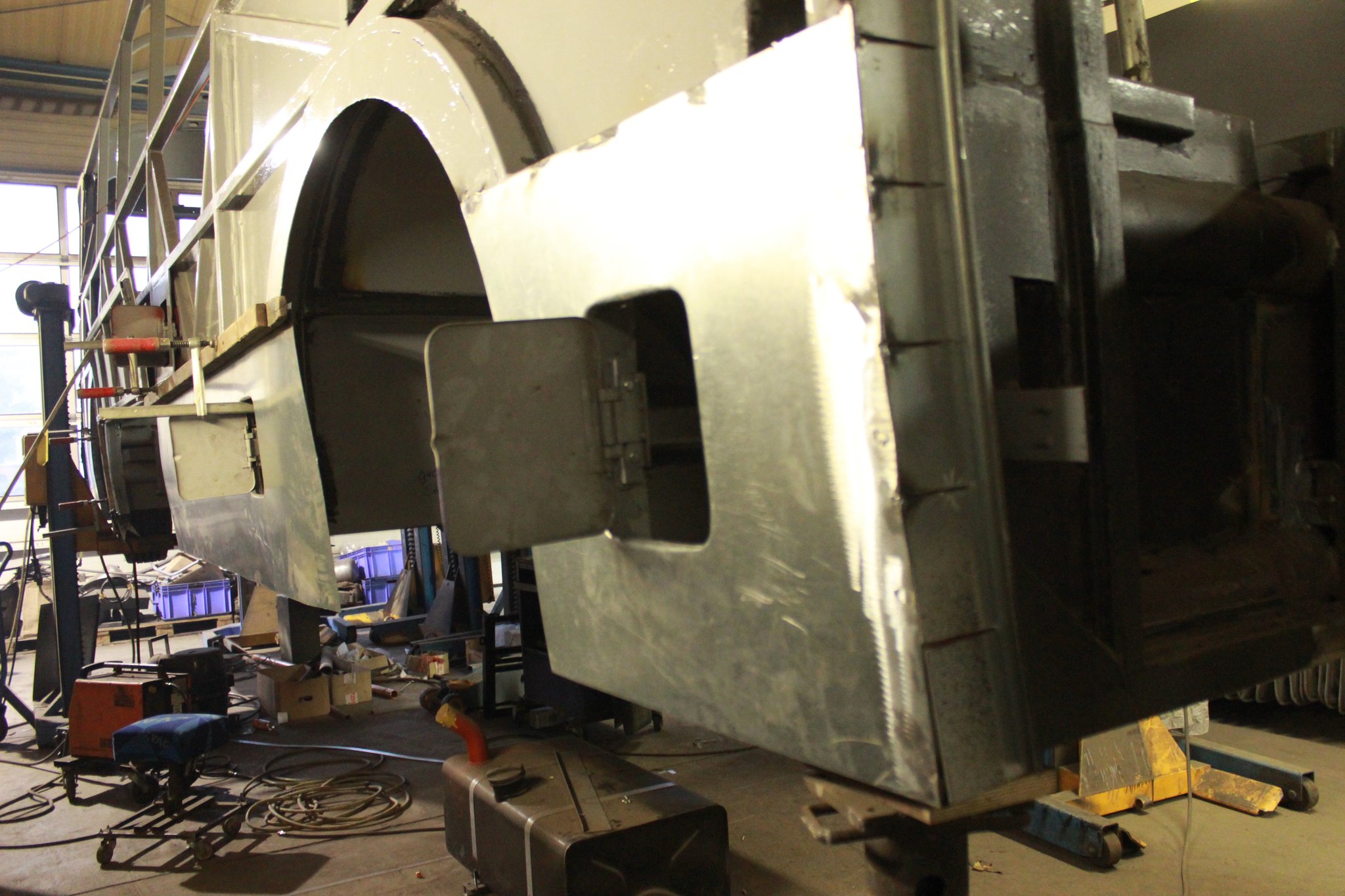 15.10.2021 - Schlosserarbeiten / Fertigstellung Gerippearbeiten B-Achse / Beblechung Heck / teilweise Beblechung der Seitenwände / anfertigen, anpassen und einbauen der Außenklappen