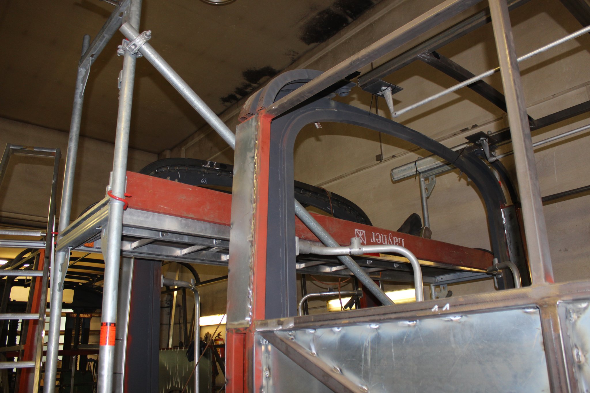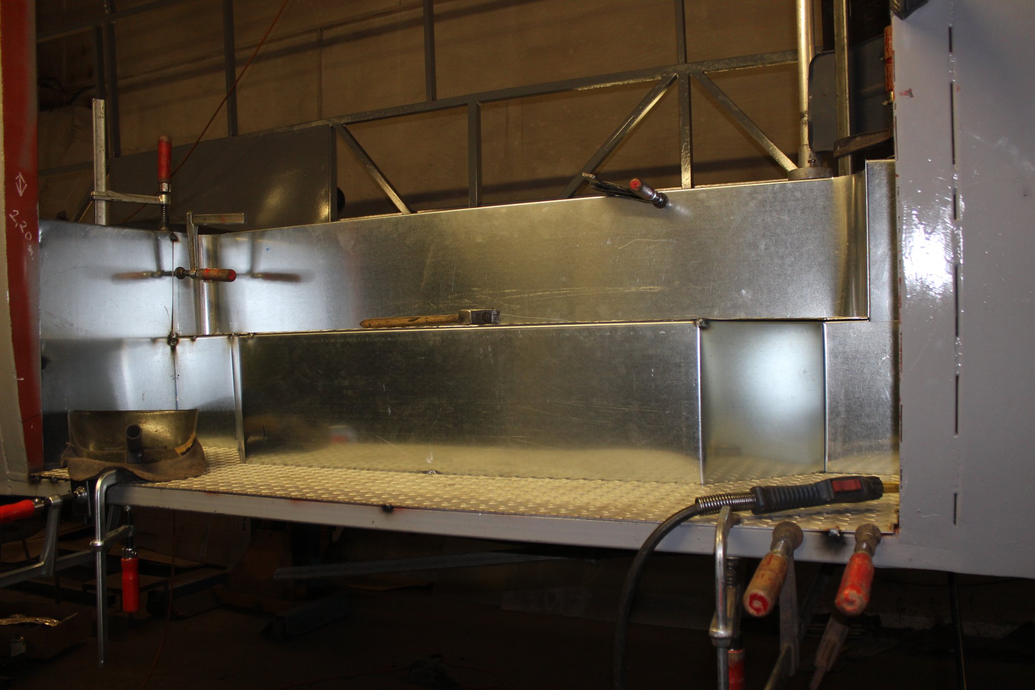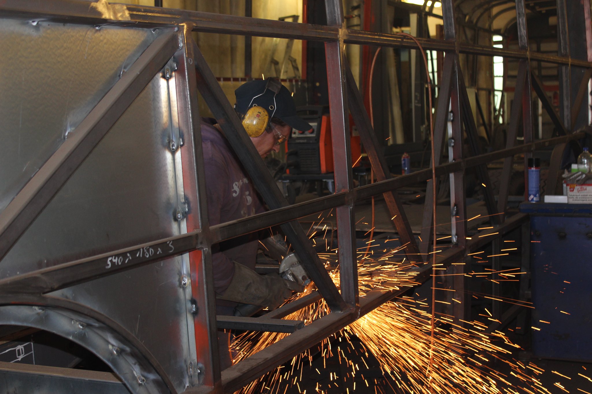 15.10.2021 - Schlosserarbeiten / Fertigstellung Gerippearbeiten B-Achse / Beblechung Heck / teilweise Beblechung der Seitenwände / anfertigen, anpassen und einbauen der Außenklappen