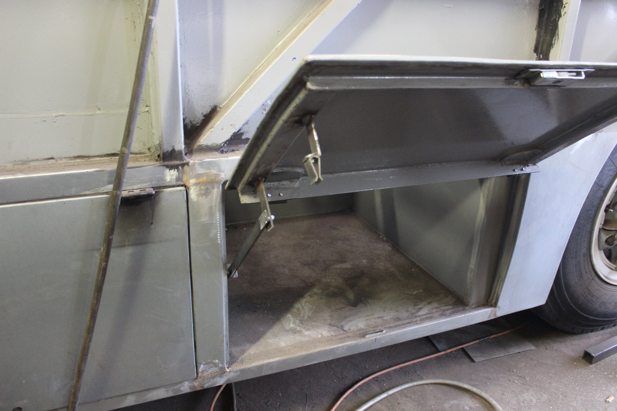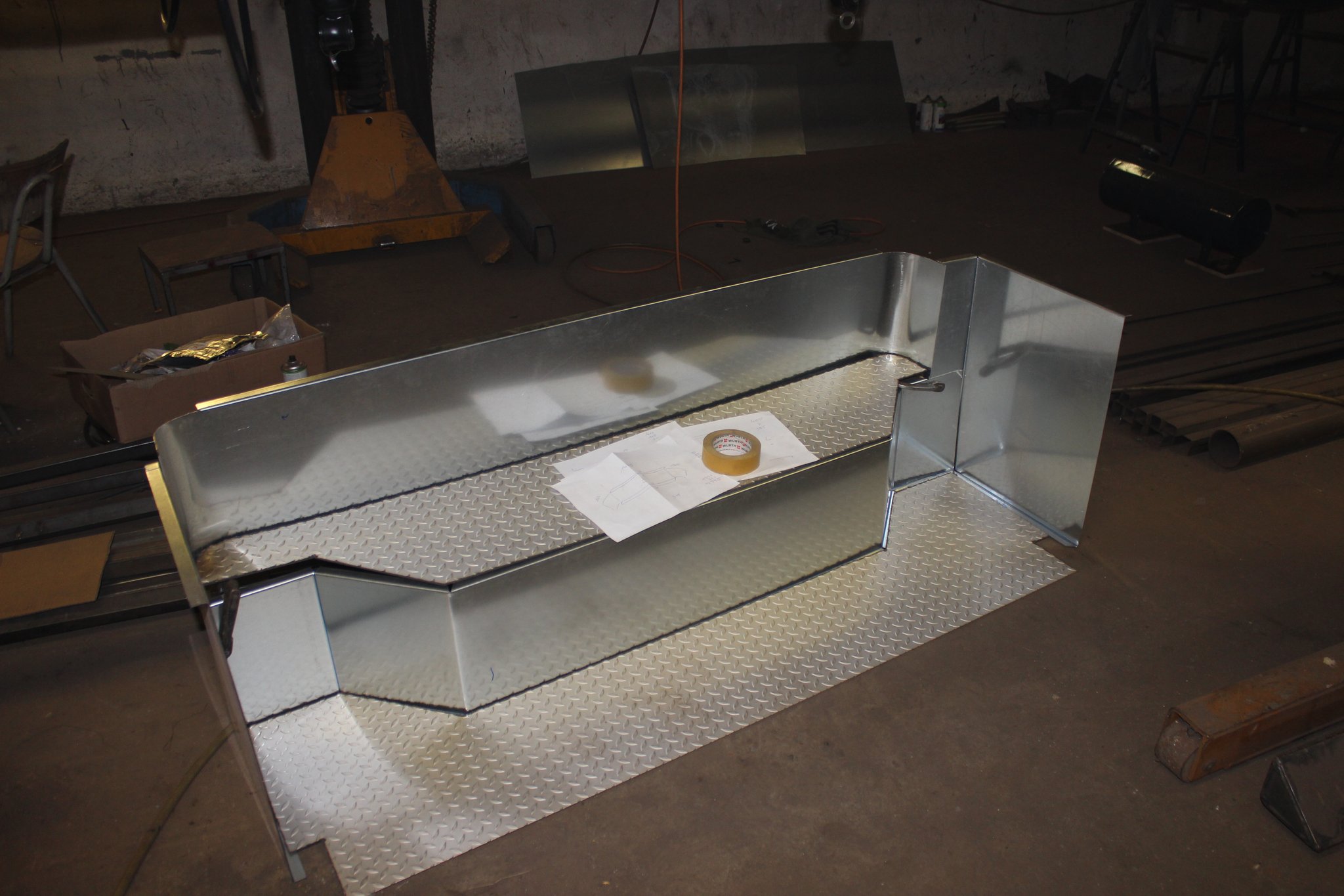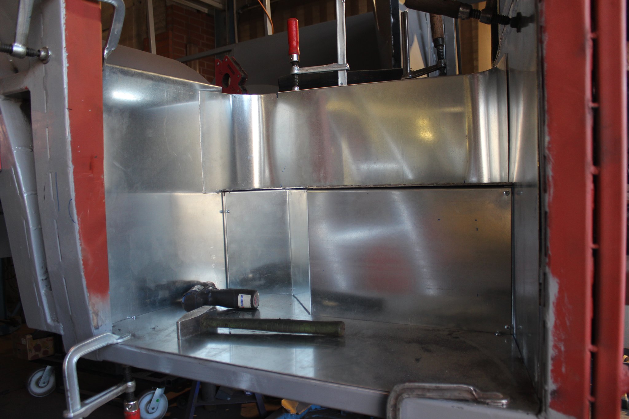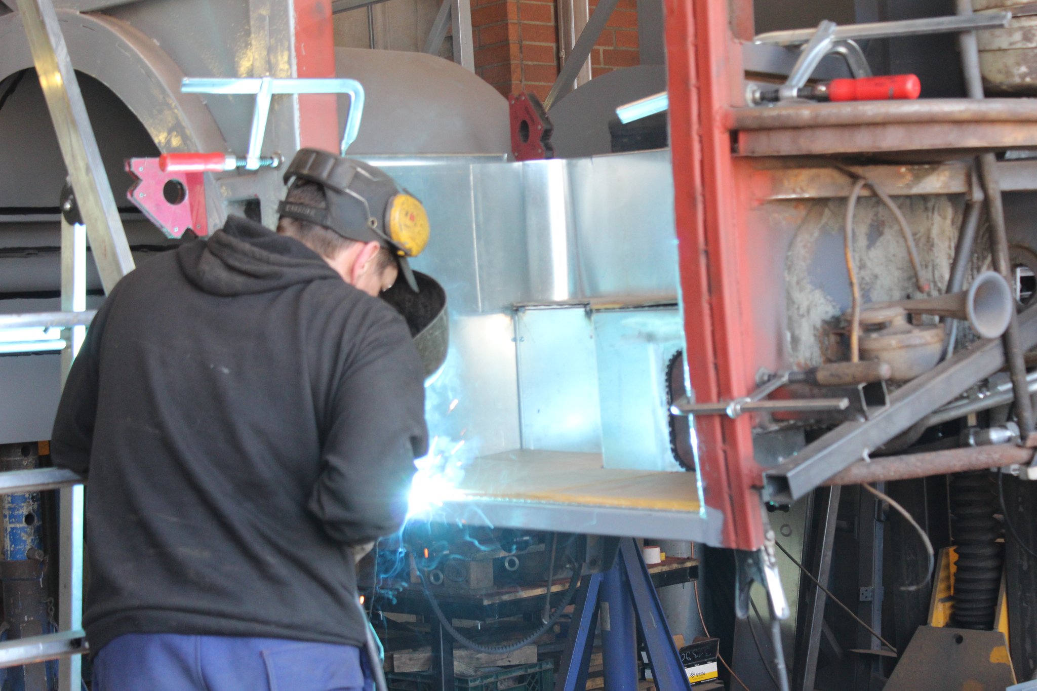 15.10.2021 - Schlosserarbeiten / Fertigstellung Gerippearbeiten B-Achse / Beblechung Heck / teilweise Beblechung der Seitenwände / anfertigen, anpassen und einbauen der Außenklappen